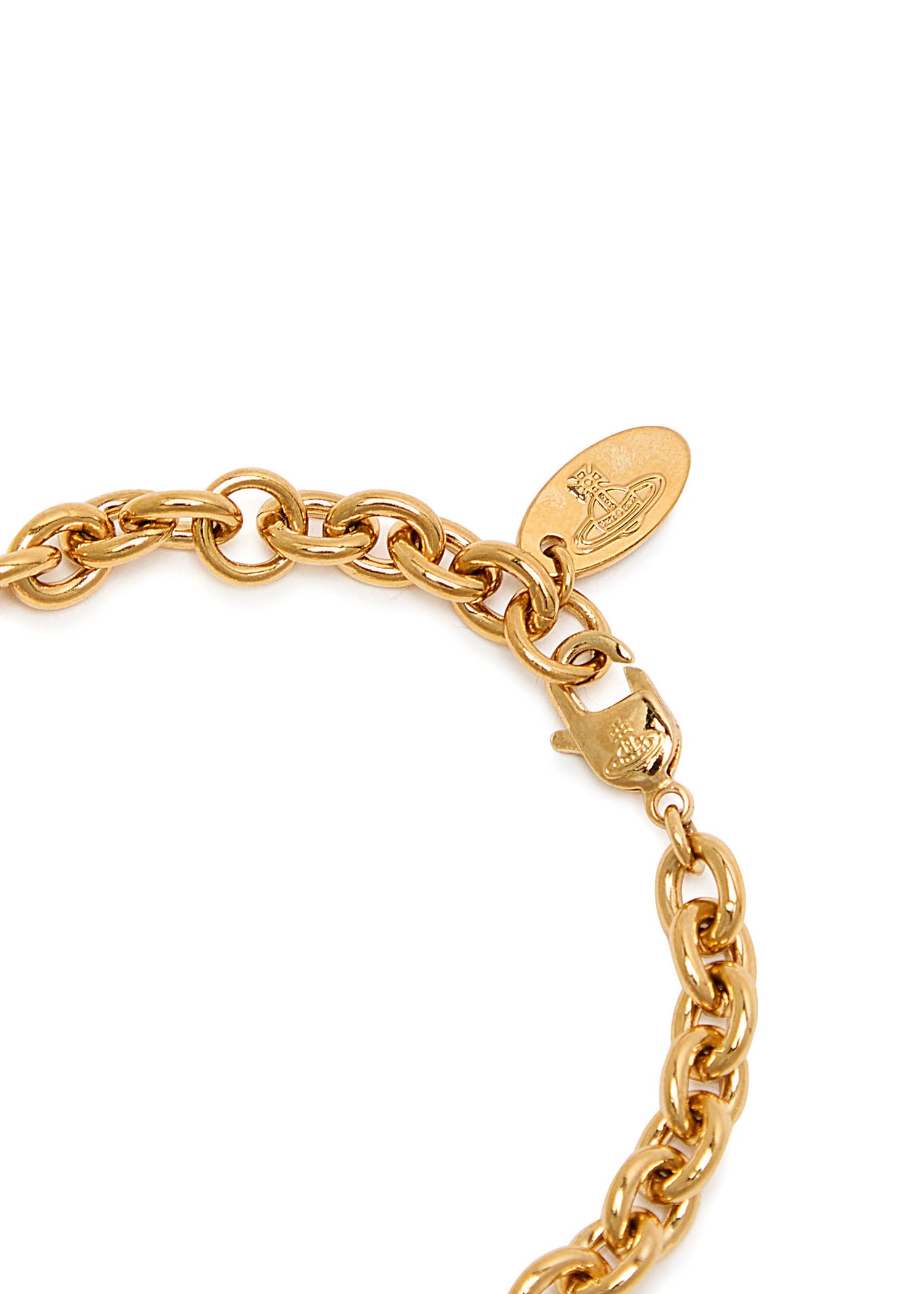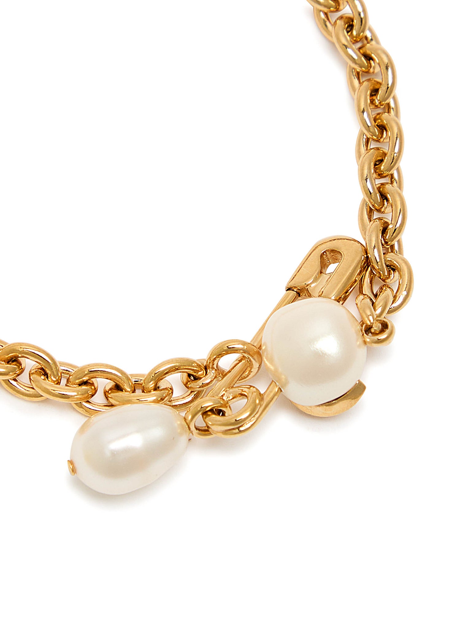 This hand-finished Vivienne Westwood metal bracelet features a safety-pin motif, a signature orb plaque, and pearl charms. It has an adjustable lobster-clasp fastening and a length of 16.5cm.