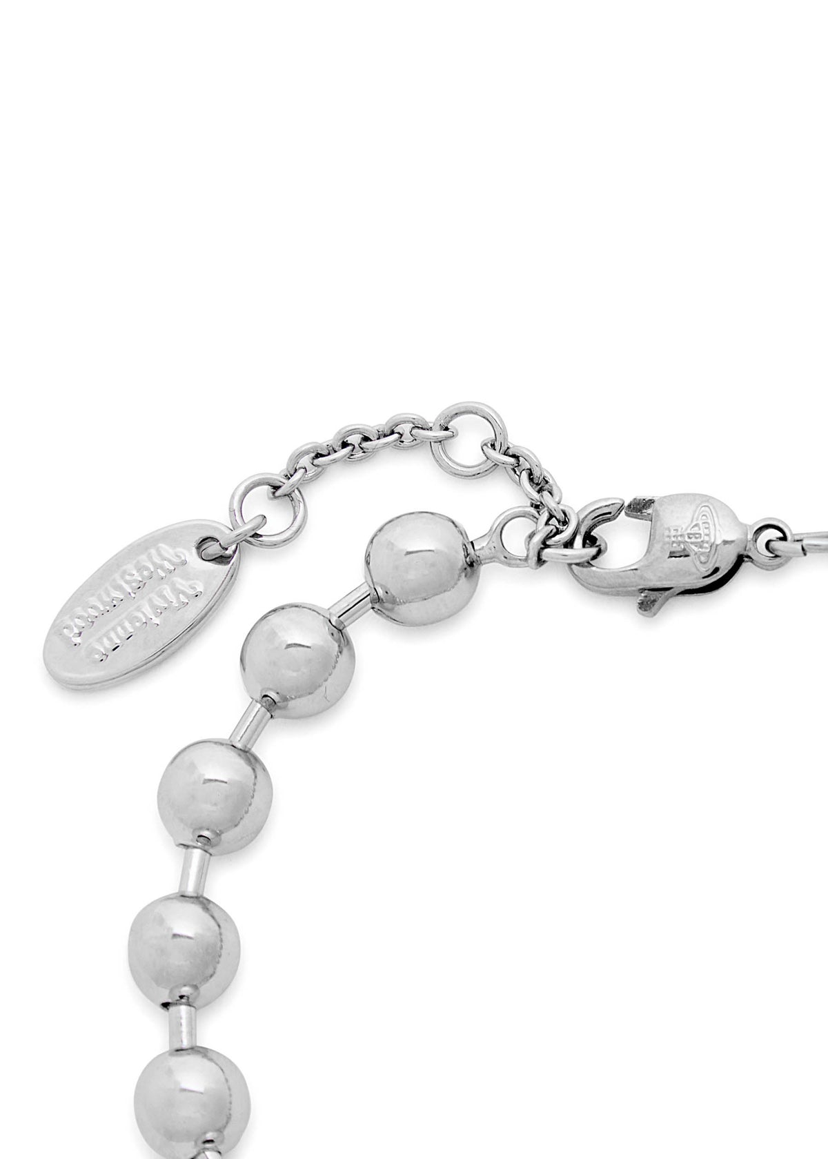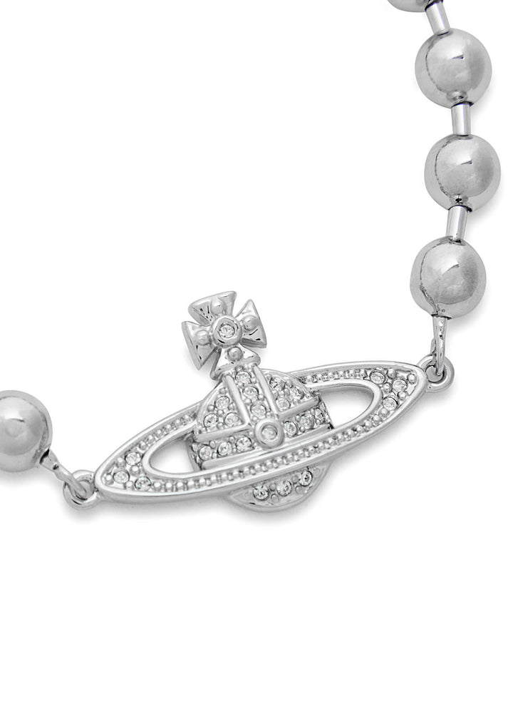 This hand-finished Vivienne Westwood metal bracelet features a beaded chain design, a textured signature orb pendant, and crystal embellishments. It has an adjustable lobster-clasp fastening and a length of 18.5cm.