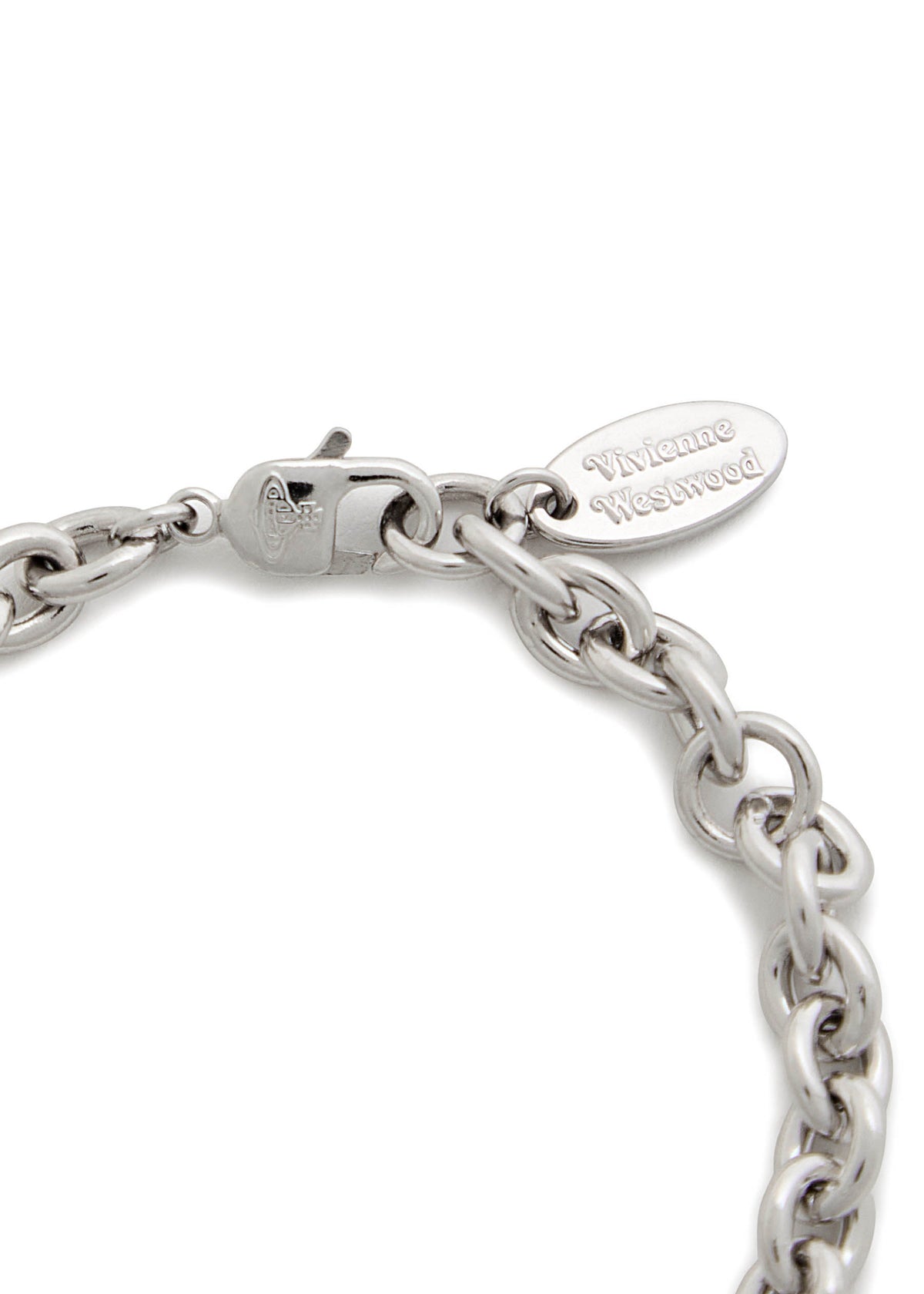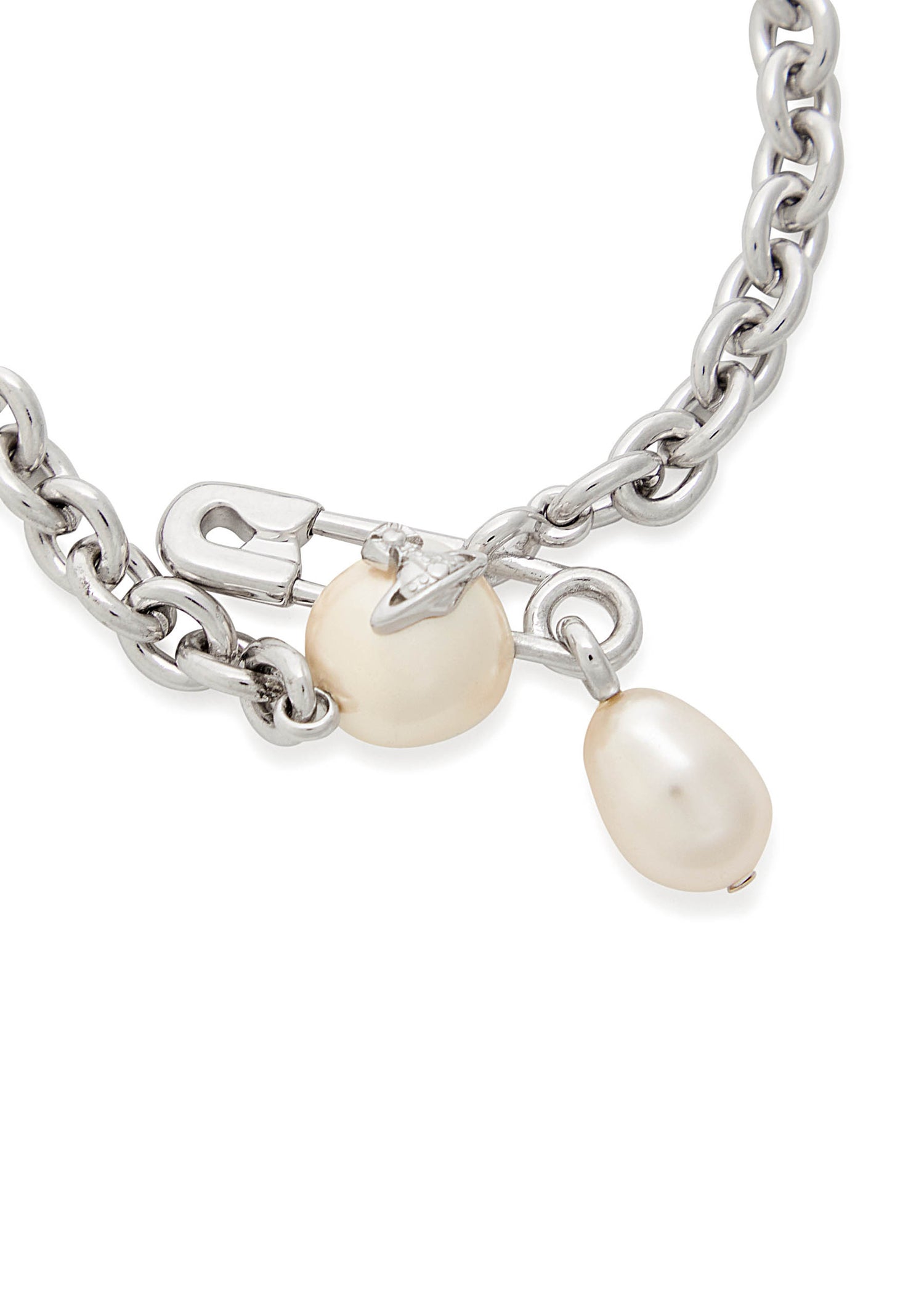 This hand-finished Vivienne Westwood metal bracelet features a safety-pin motif, a signature orb plaque, and pearl charms. It has an adjustable lobster-clasp fastening and a length of 16.5cm.