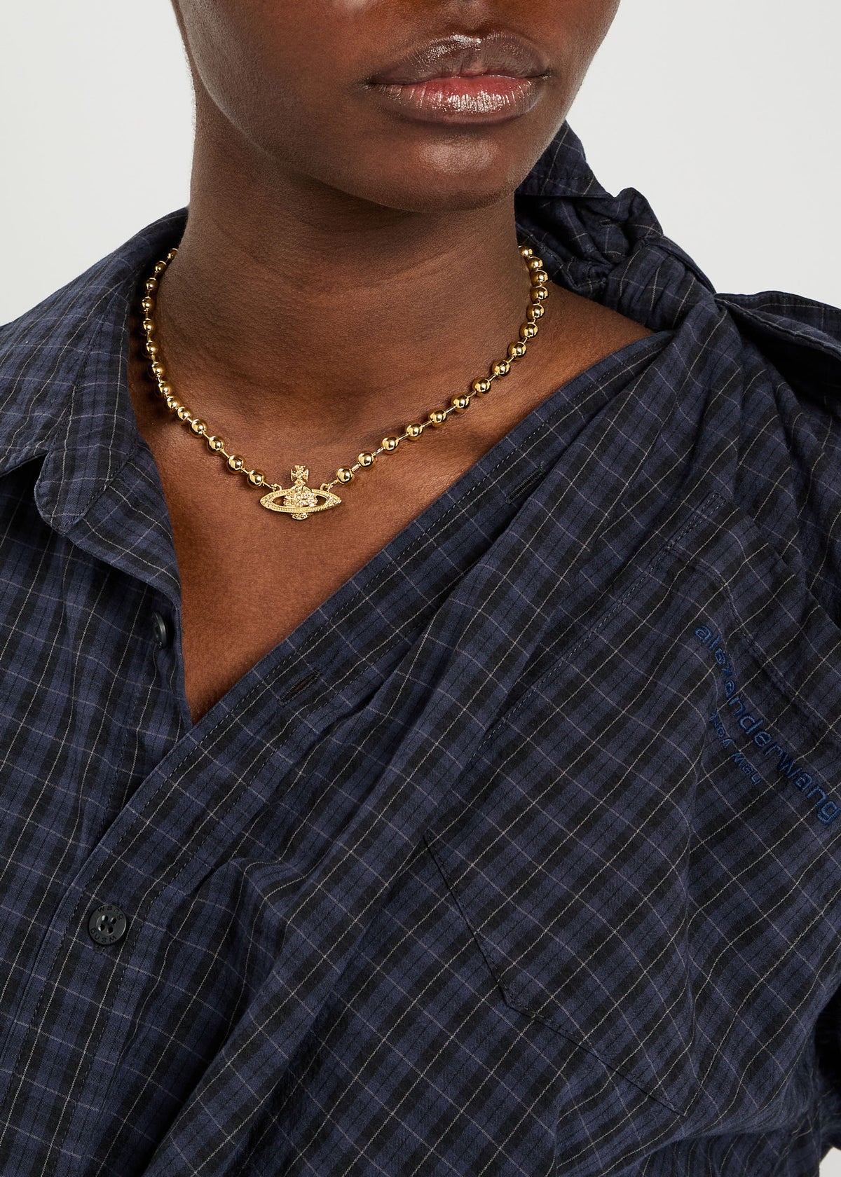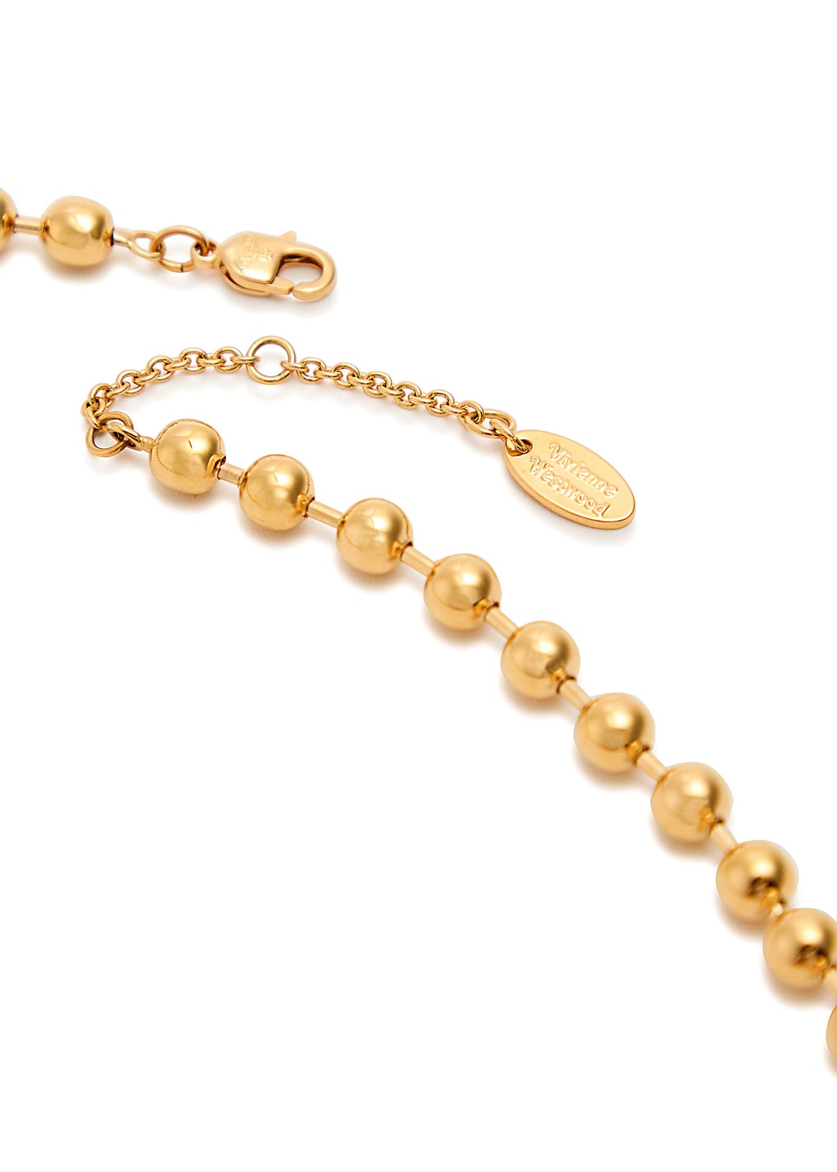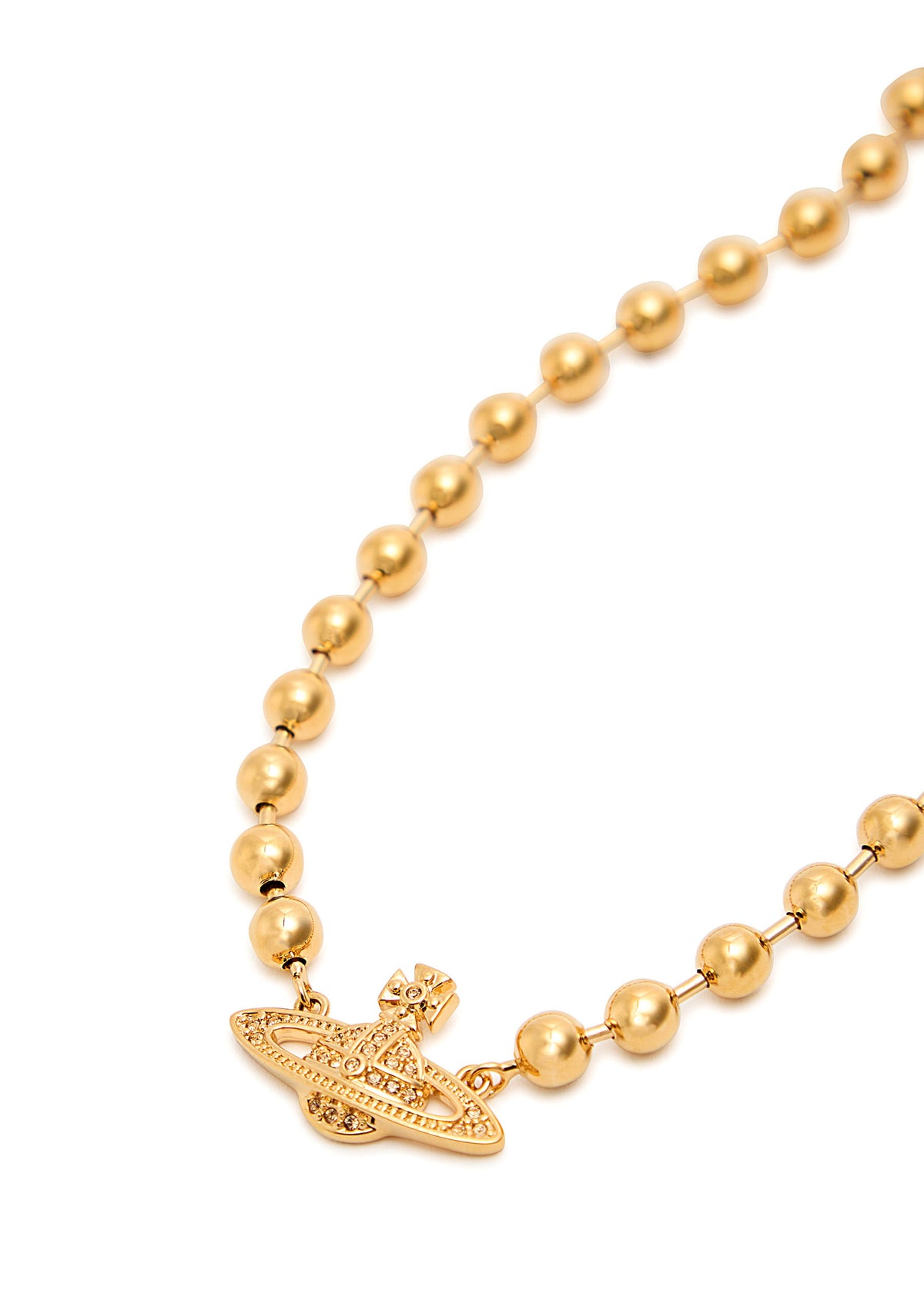This hand-finished Vivienne Westwood metal necklace features a beaded chain design, a textured signature orb pendant, and crystal embellishments. It has an adjustable lobster-clasp fastening and a length of 43.5cm.