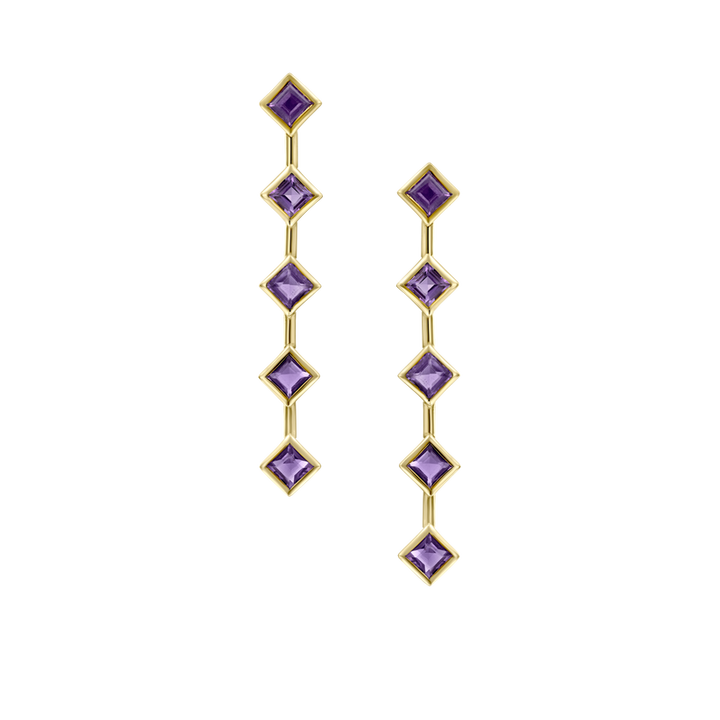 These Evening at the Palace Earrings – Yellow Gold by Gwenne offer a dazzling fusion of warm yellow gold and vibrant amethyst stones. Part of the Règne Collection, they beautifully reimagine ancient royal elegance for today's glamour. The stunning Princess cut amethysts capture the essence of a red carpet allure, delivering a majestic vibe. Ideal for turning any event into a regal affair, this piece symbolizes power and refined sophistication.