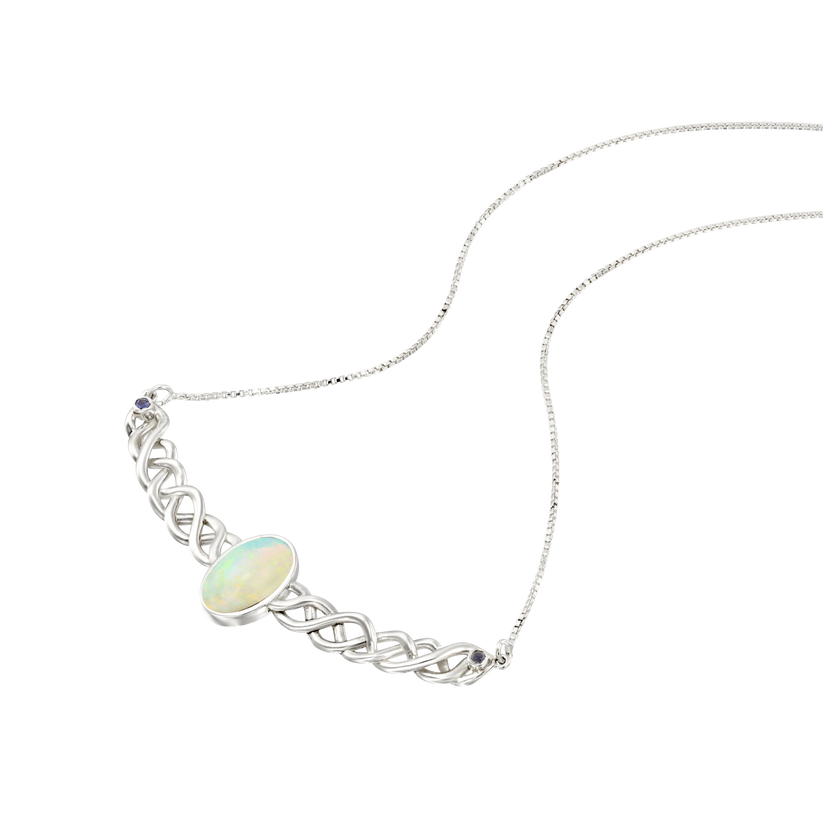 Crafted from 14k white gold, the necklace chain is 18 cm long on each side. The 7 cm-long pendant is embedded with a rare natural opal (13x9 mm). The net weight is 10 g.