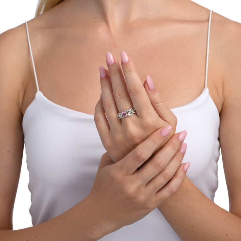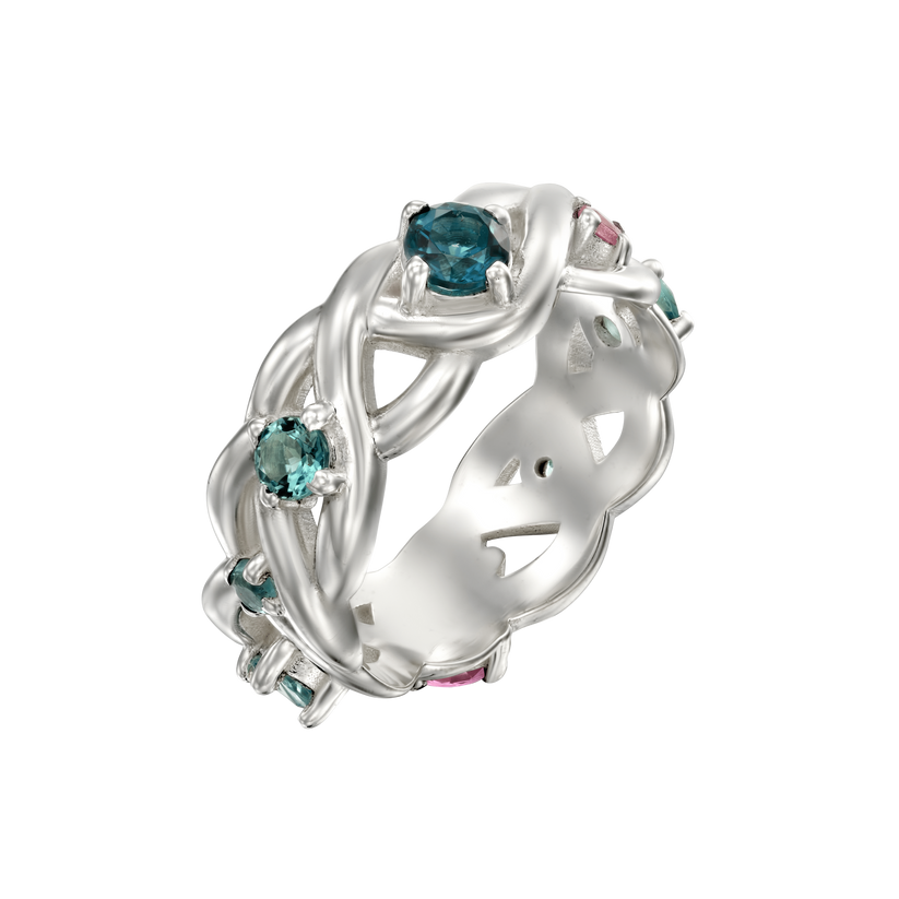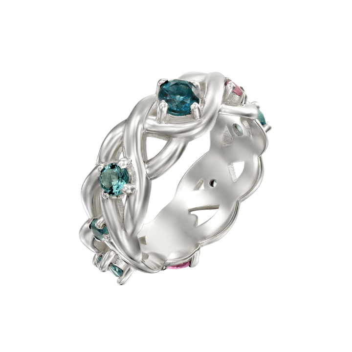 This Princeps I Ring White Gold by Gwenne is a designer favorite and a modern, aristocratic tribute to mediaeval princesses. Crafted in white gold, it features patterns inspired by the intricate Celtic knot. Adorned with eight beautiful pastel tourmalines, it strikes a perfect balance between tribal heritage and royal vibes, making it an ideal, symbolic gift to honor someone special, such as a new mother.