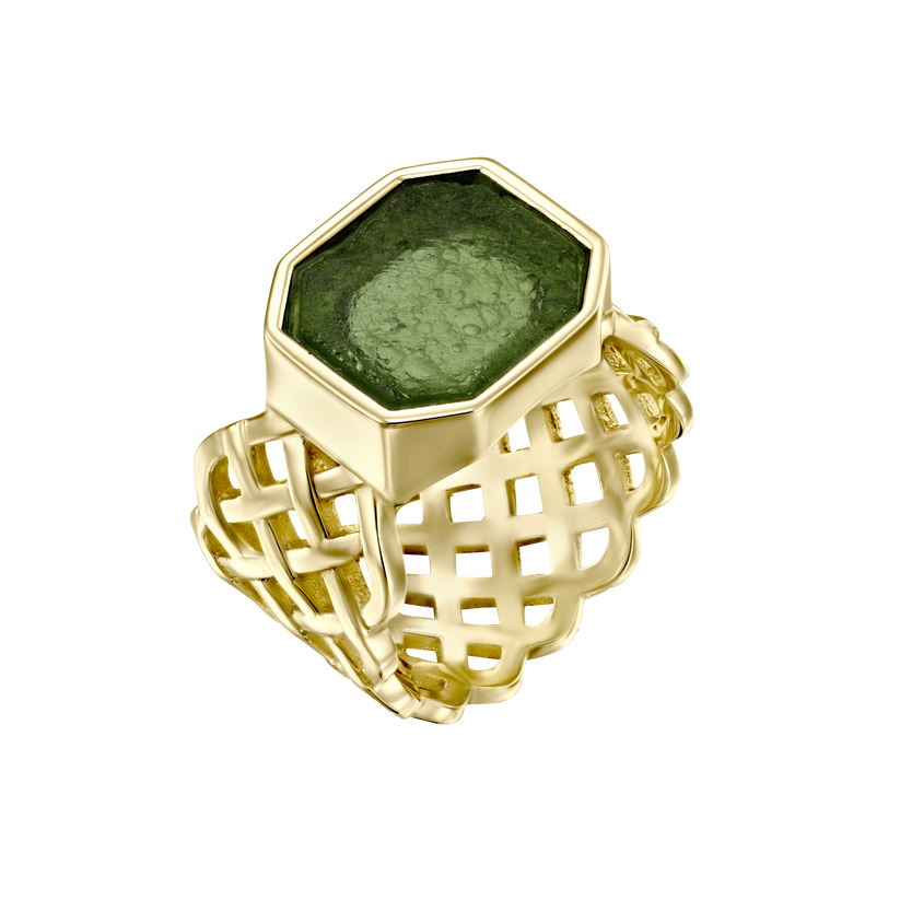 Crafted from 14k yellow gold and set with a rare 13 mm Moldavite Meteorite stone. The approximate weight is 18.5 g. Available in various sizes (personalized sizing available).