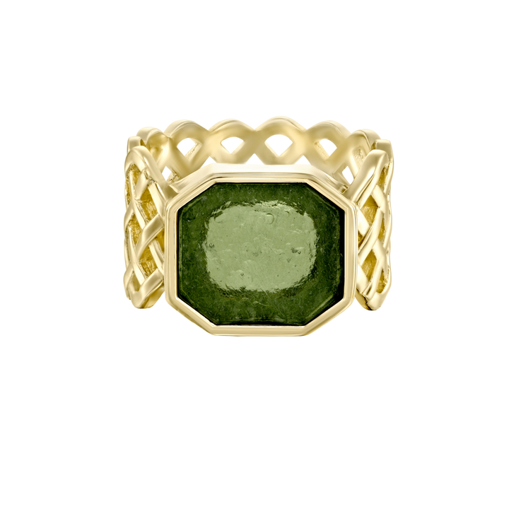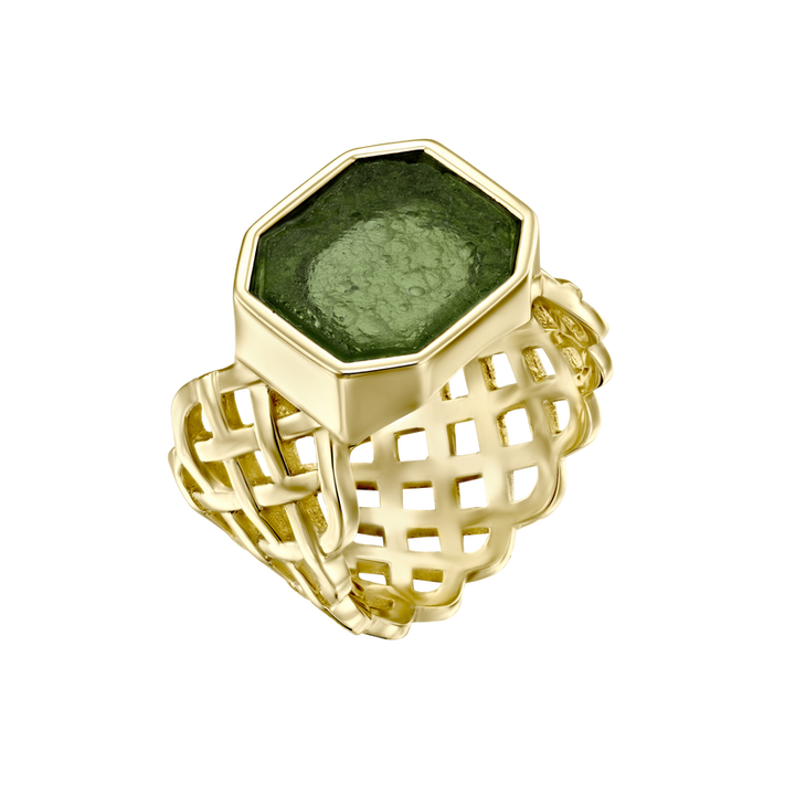 This Chivalry Ring – Yellow Gold by Gwenne is a bold, historical tribute to knightly valor and strength. Blending warm yellow gold with a unique, rare Moldavite meteorite stone, this Règne Collection piece expertly fuses ancient history with modern edge. Designed for men but perfect for anyone looking to make a stylish, powerful statement, it symbolizes protection and the enduring spirit of courage.