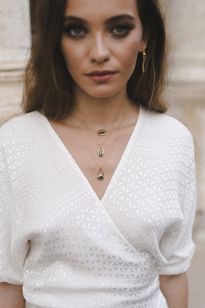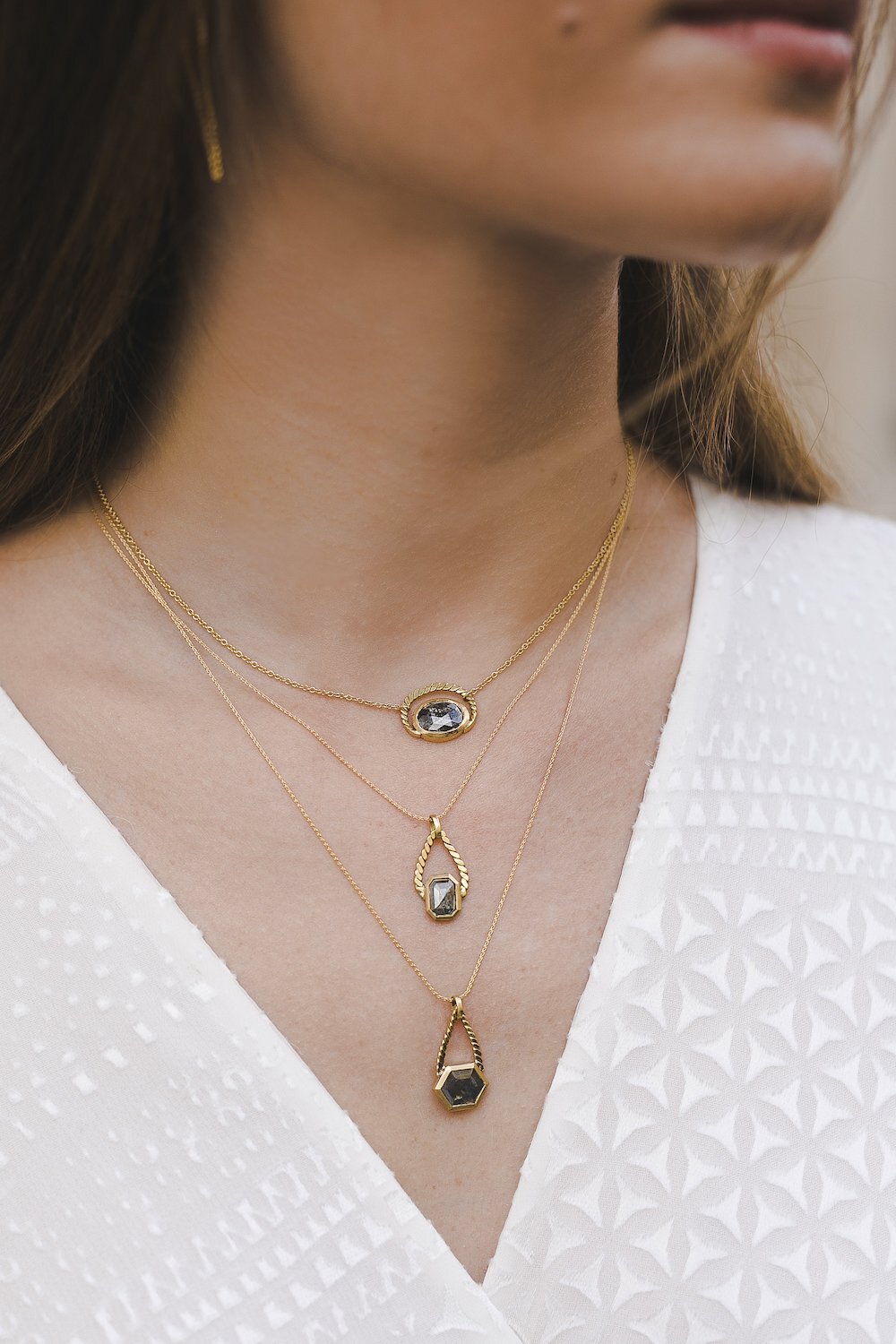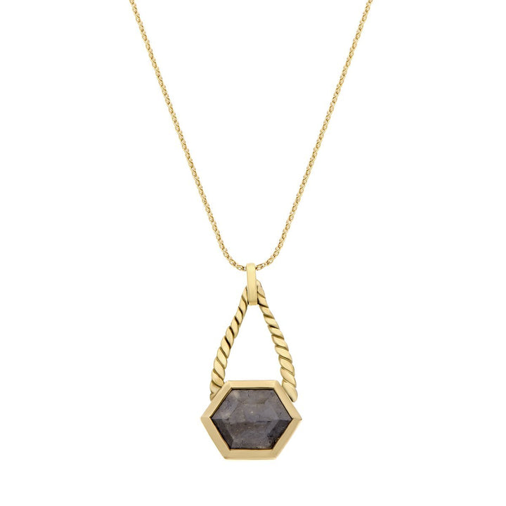 Resembling the tip of an enduring flame, the Hexagon Drop necklace is a unique example of filigree jewelry that will defy all your expectations and elevate your look. The star of this necklace is a rose-cut grey diamond, which works as negative space while simultaneously highlighting the beauty of the 18k yellow gold. Hand-twisted wire is a unique sculptural element that makes the necklace memorable and enduring.