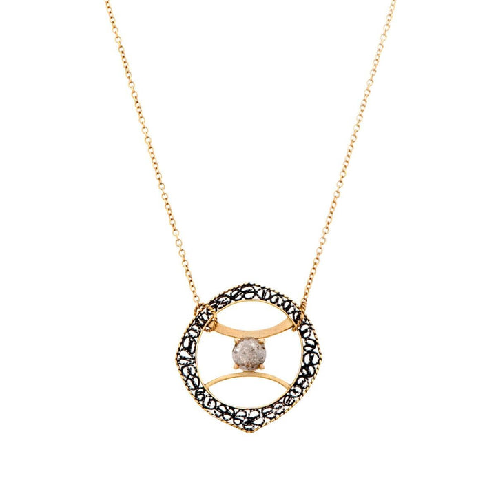 Utilizing the beauty and wonder of negative space, the Sister's Keeper necklace is inspired by the traditional Kaballistic wedding ring, which is shaped on the outside like a square. A round salt-and-pepper diamond seems to levitate effortlessly in the center of the pendant and is surrounded by a lattice border of oxidized sterling silver filigree, handcrafted by the designer. A protective diamond shield, this necklace carries meaning and history in its design.