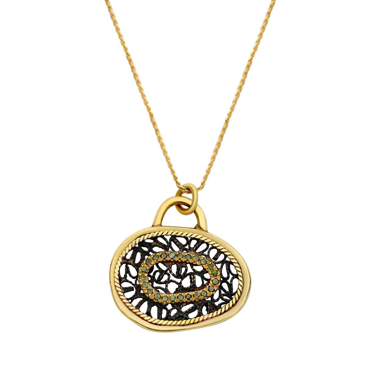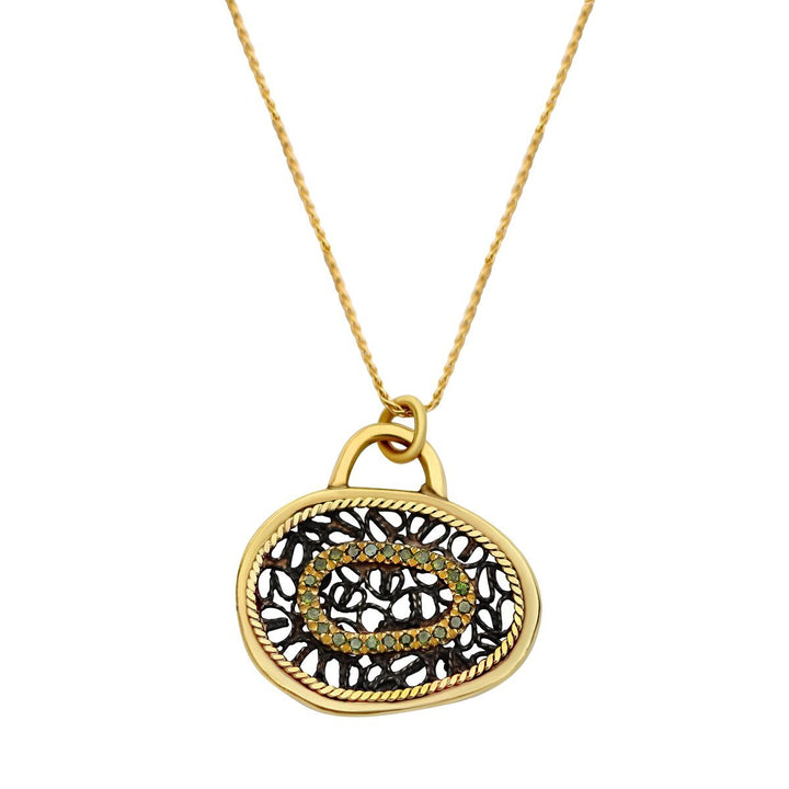 The Labyrinth necklace connects with the ancient idea of duality: confusing or foreboding from within, but in finding the right path one can achieve serenity and confidence. An organic hand-hammered gold oval frames the oxidized sterling silver filigree maze within and is topped with a path of green diamonds. This pendant is sure to become your new signature piece, perfect for everyday wear and easy to layer with other necklaces.