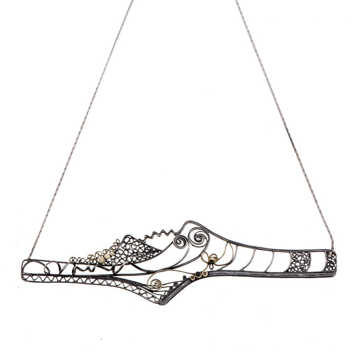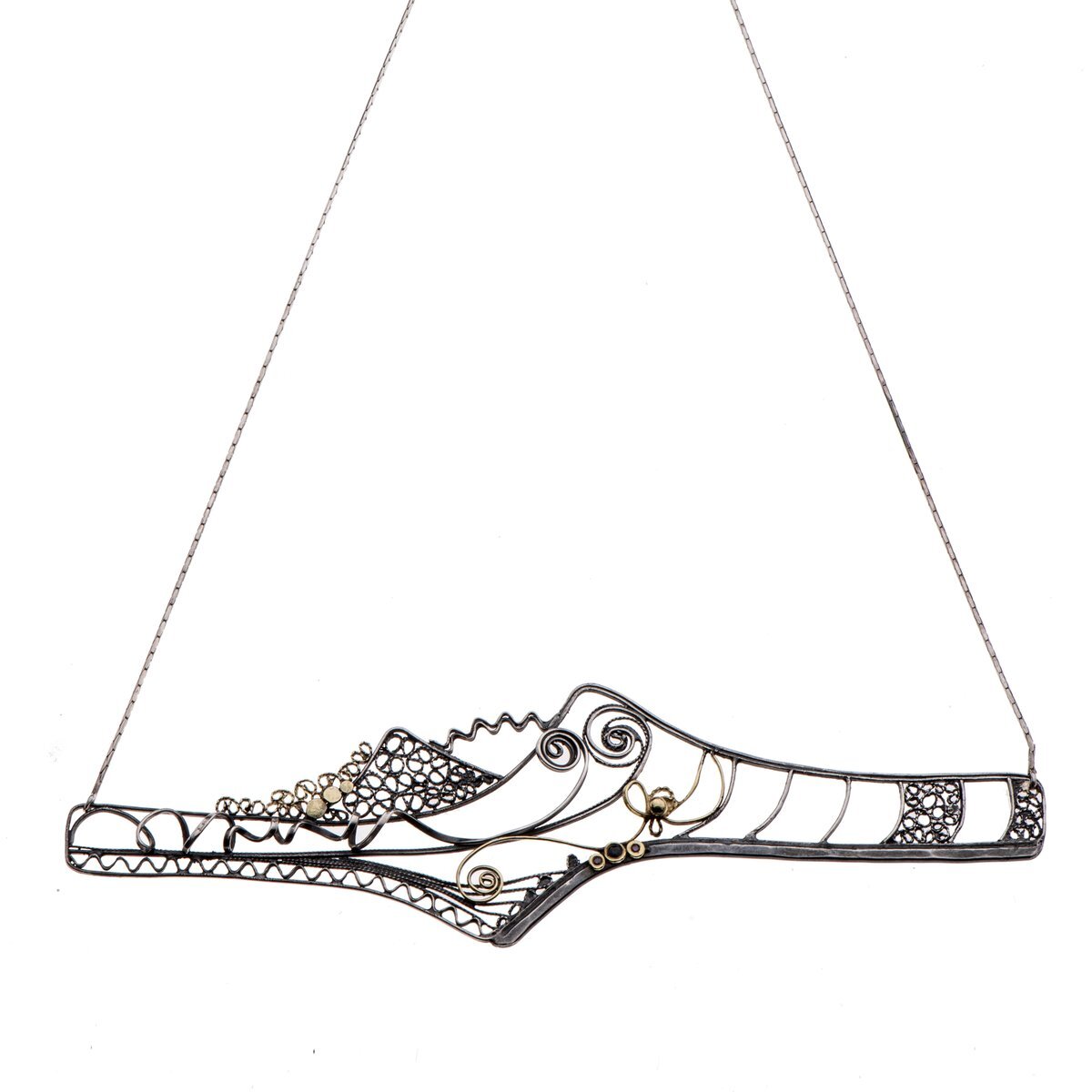 A statement necklace that uses traditional techniques to depict this abstract interpretation of nature. The Tsunami necklace illustrates the powerful and unpredictable energy of a tsunami through delicate oxidised silver and 18k gold filigree. This one-of-a-kind piece was inspired by real natural events with filigree to depict the wind, waves, soil, and tumbling rocks moving across a landscape. Two rubies and a blue sapphire add balance and color to this unforgettable piece.