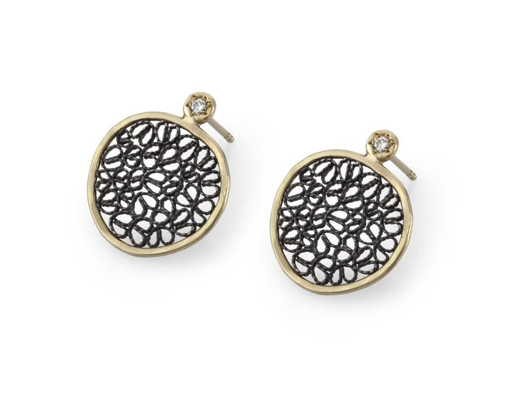 The Dreamcatcher earrings can be your protective talisman, capturing negative energy and thoughts in their intricately-woven oxidized sterling silver filigree design. With their organic, hand-hammered 18k yellow gold oval frames, these earrings are extremely flattering for any face shape, perfect for everyday wear and easy to pair with your other fine jewelry. Each earring features a single white diamond stud capping the post for a hint of sparkle.