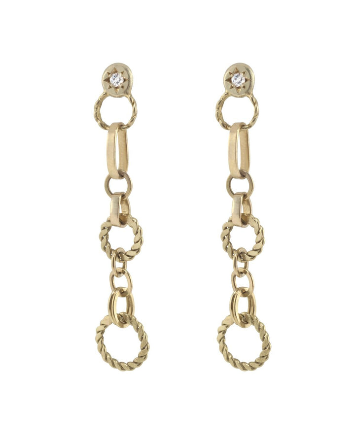 Crafted from hand-twisted and flattened filigree links mixed with smooth, handmade 18k gold circle links, these elegant Mixed Chain filigree earrings are truly fun to wear. They move and sway beautifully, almost dancing on the ear. Two sparkling white diamonds are nestled in 'north star' settings for just the right amount of sparkle to compliment any occasion.