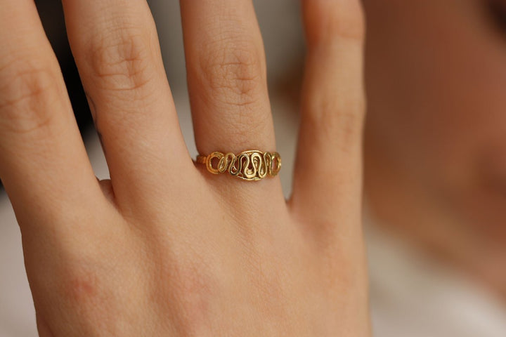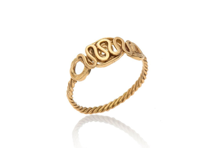 The Meander Ring reflects the winding curve of a river-bend. Reminiscent of ancient and archaeological styles of jewelry, its band of twisted gold wire joins with two open circles. It centers on a sculptural free-form spiral crowned with the wave pattern of the meandering river. This ring combines the ancient and the modern into a light, wearable piece of everyday jewelry.
