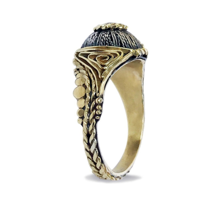 A one-of-a-kind treasure with a storied past, the Blue Spire filigree ring is a labor of love that required hours of painstaking work to bring to life. The ornate sterling silver dome that sits beneath the round-cut blue sapphire is actually an unfinished piece by Sharon's great uncle, an expert Yemenite silversmith who taught her the craft. Crafted from 18k gold, the asymmetrical design on each side of the setting is surprising in an elegant way. It's a true collector's piece infused with many generations' worth of creative energy.