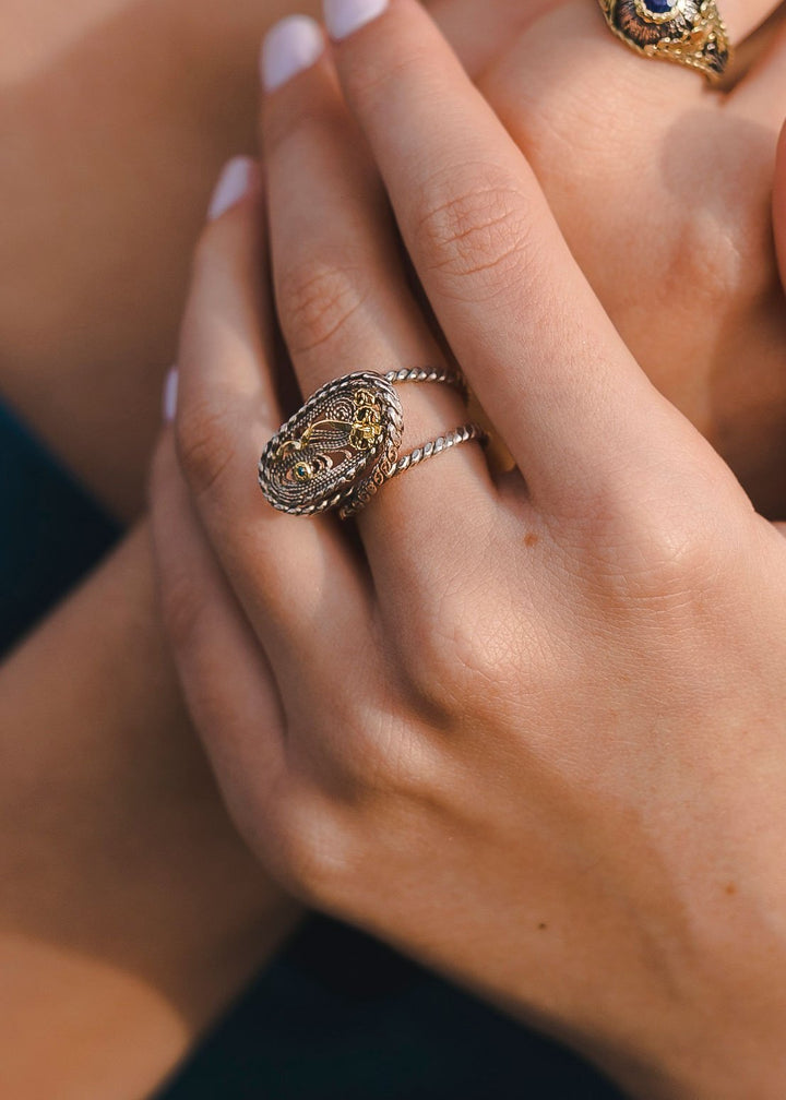 Inspired by the work of Spanish artist Joan Miró, the aptly-named Miro ring is like a miniature painting handcrafted from an oxidized sterling silver filigree design with 18K gold accents, including ribbon-twisted gold wire. One blue diamond accent adds a hint of color to this bold statement ring, which features a truly unique side profile that looks like an elevated bridge.