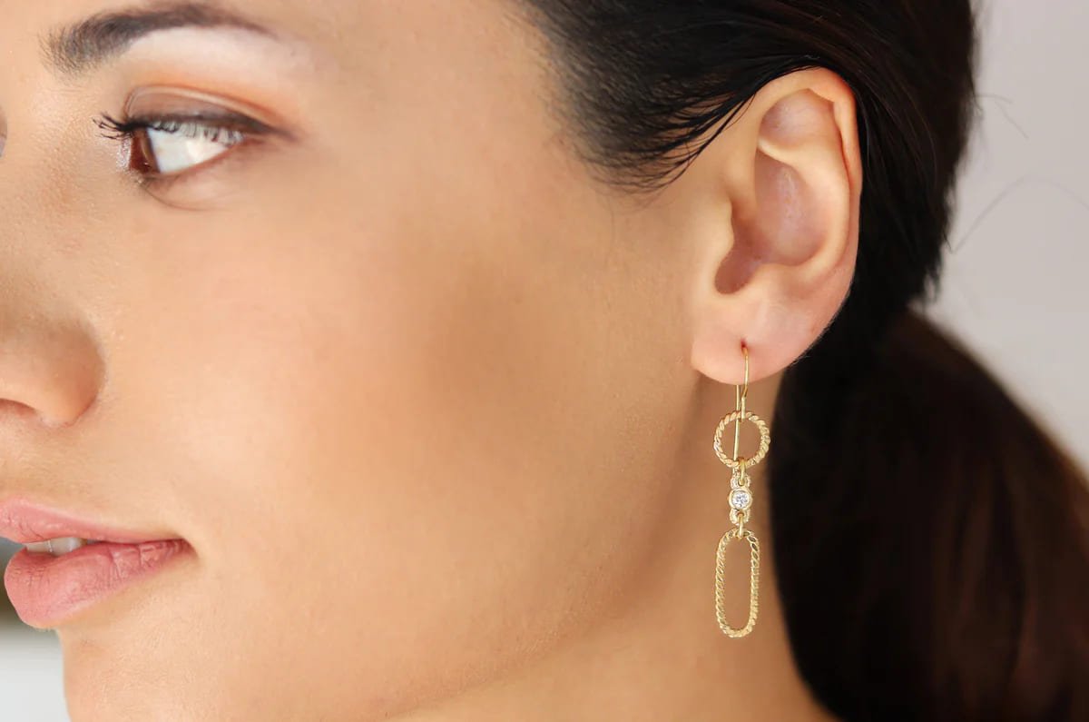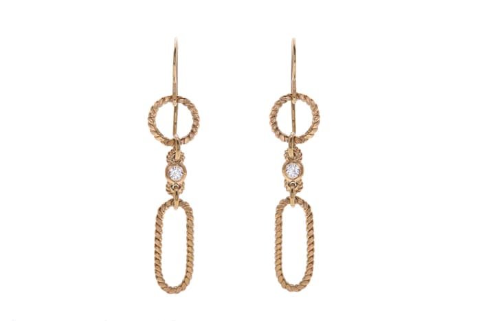 The Cocoon earrings celebrate the organic natural forms found in nature. Crafted from twisted 18k yellow gold, the earrings feature a circular top element attached to an organic oval shape that dangles by our signature diamond-set textured link. These easy to wear earrings move with the natural cadence of your body, adding a subtle warmth to your jewelry collection.