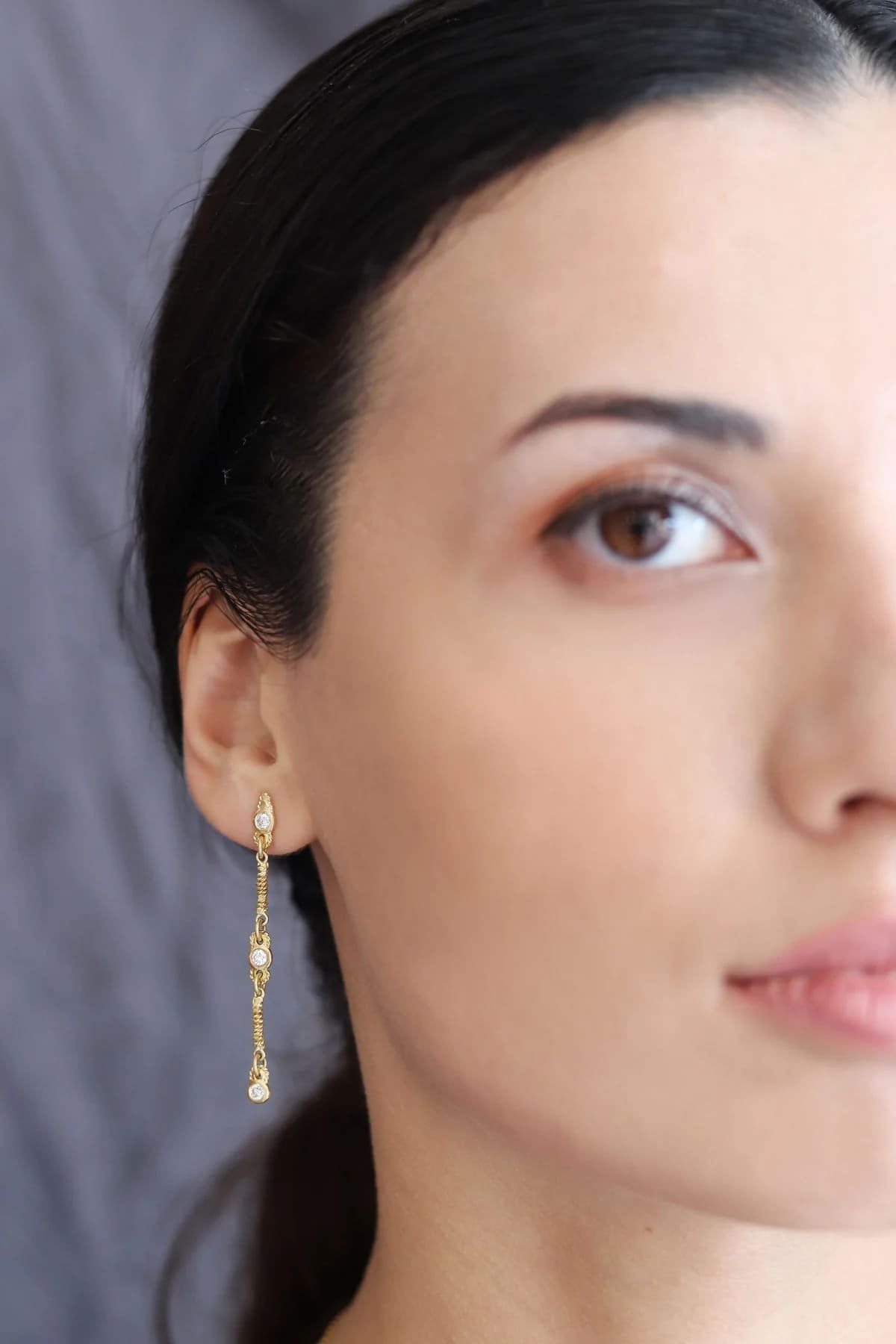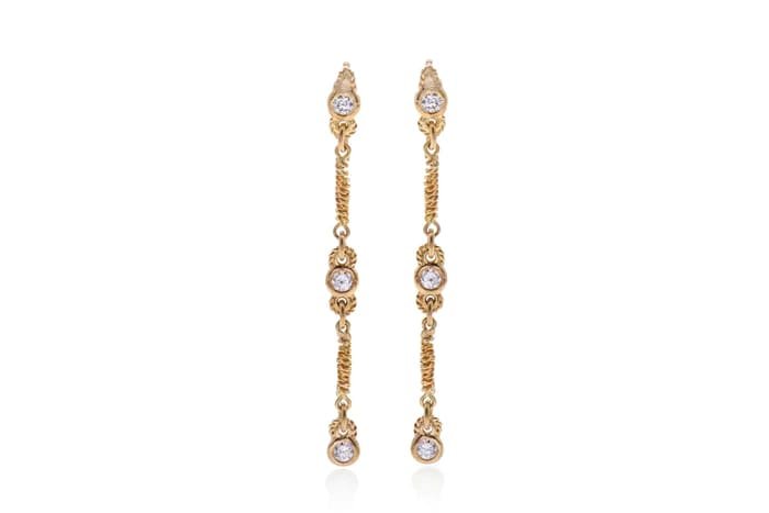 Featuring dynamic movement and mesmerizing texture, the Serpentine earrings move and sway beautifully on the ear. With alternating diamond and elongated links, they incorporate hand-twisted 18k gold wire around each element. An elegant line earring to compliment any outfit or occasion.