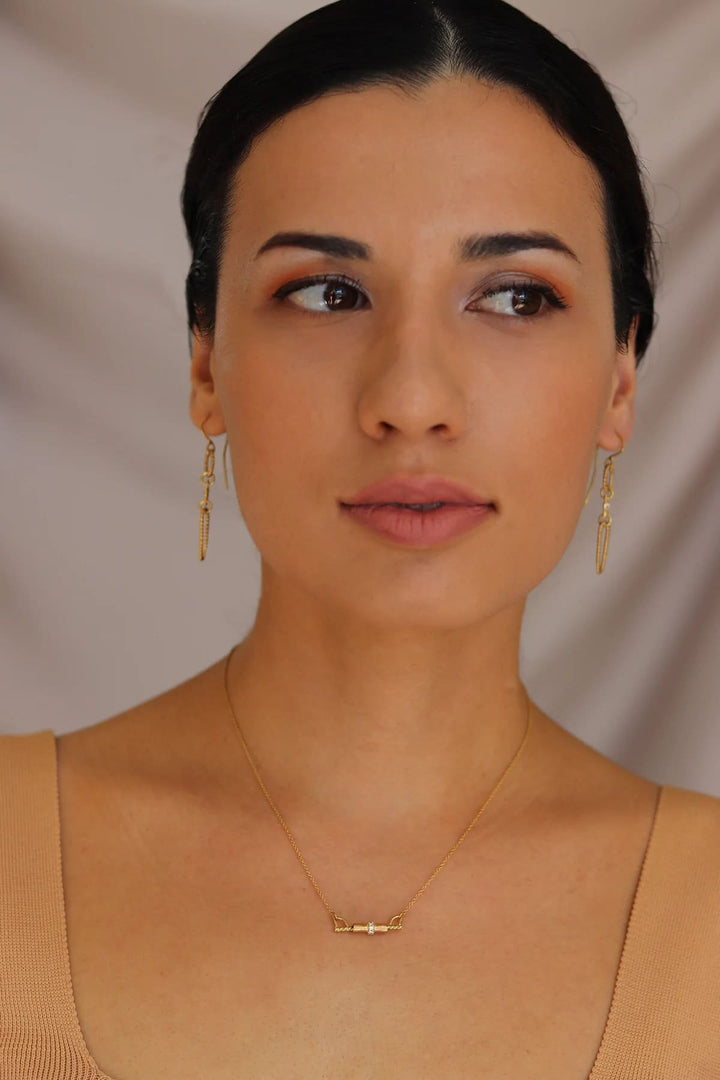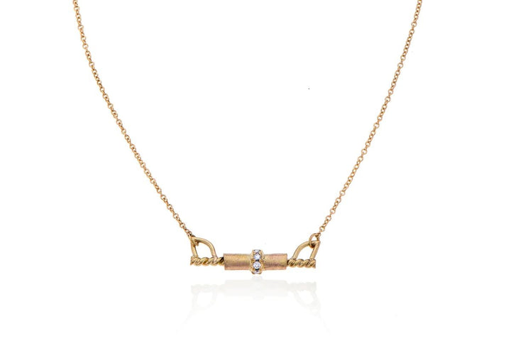 Composed of a twisted bar crowned with stylized kitten ears and a diamond-set rotating central feature, this necklace is a statement in minimalist charm. This feline inspired necklace invites you to play by incorporating tactile aspects such as the textured, twisted gold bar and the rotating diamond-set central element.