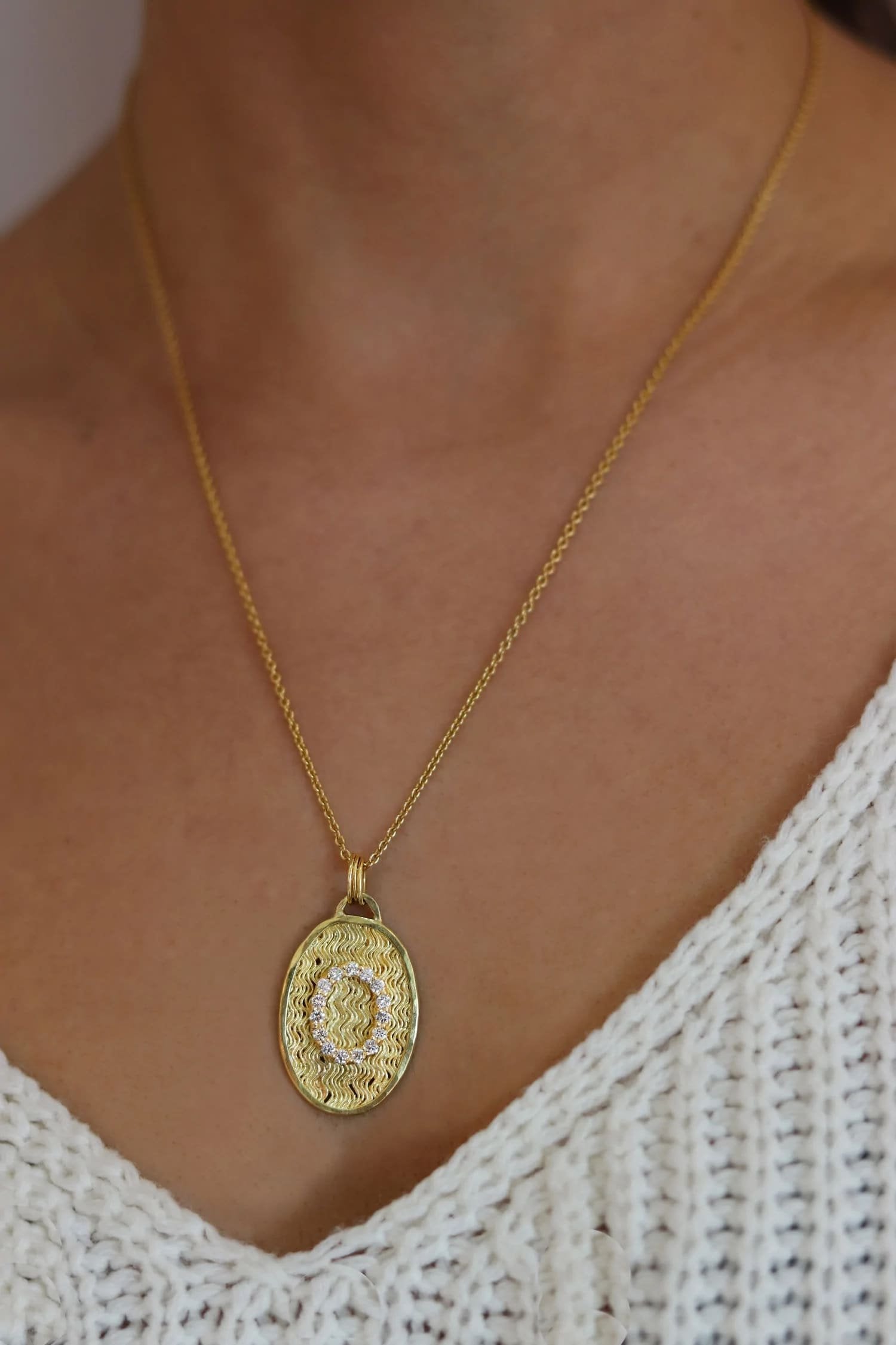 The exquisite Mirror necklace reminds us that we need only to pause and gaze to see the wonder reflected around us. Formed from 18k yellow gold, the oval-shaped base is textured with a rippling pattern. Set on top of these sinuous waves is a circle of glittering white diamonds that appear to float above the mesmerizing mirror of undulating gold.