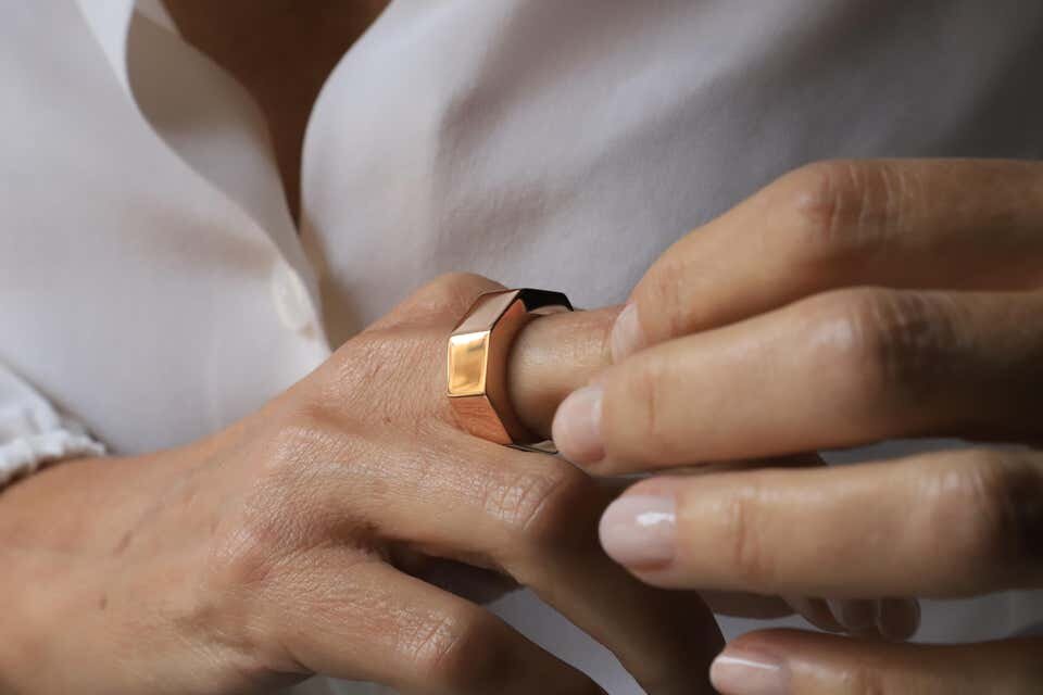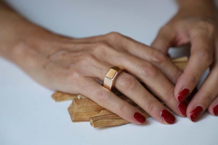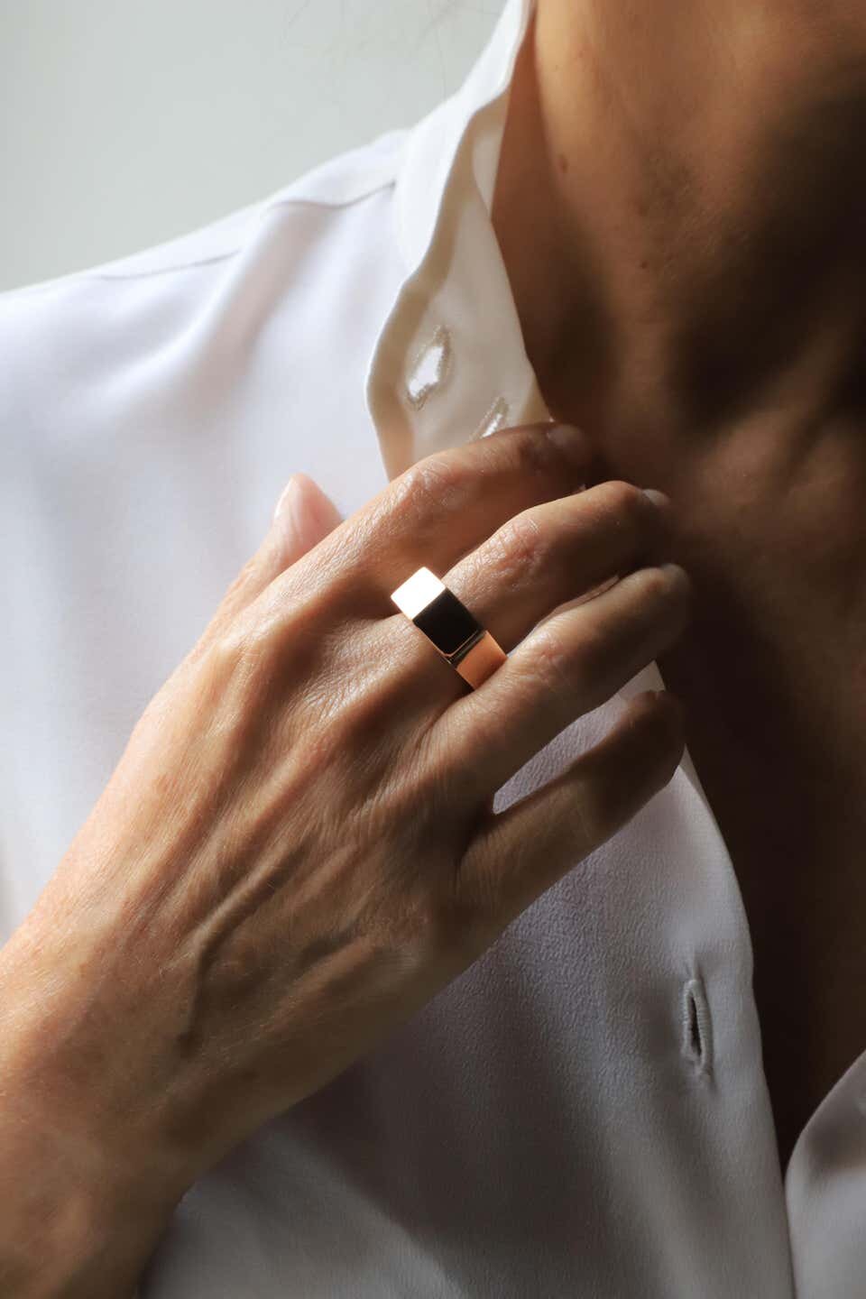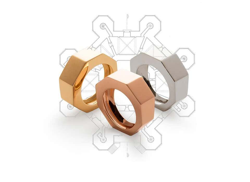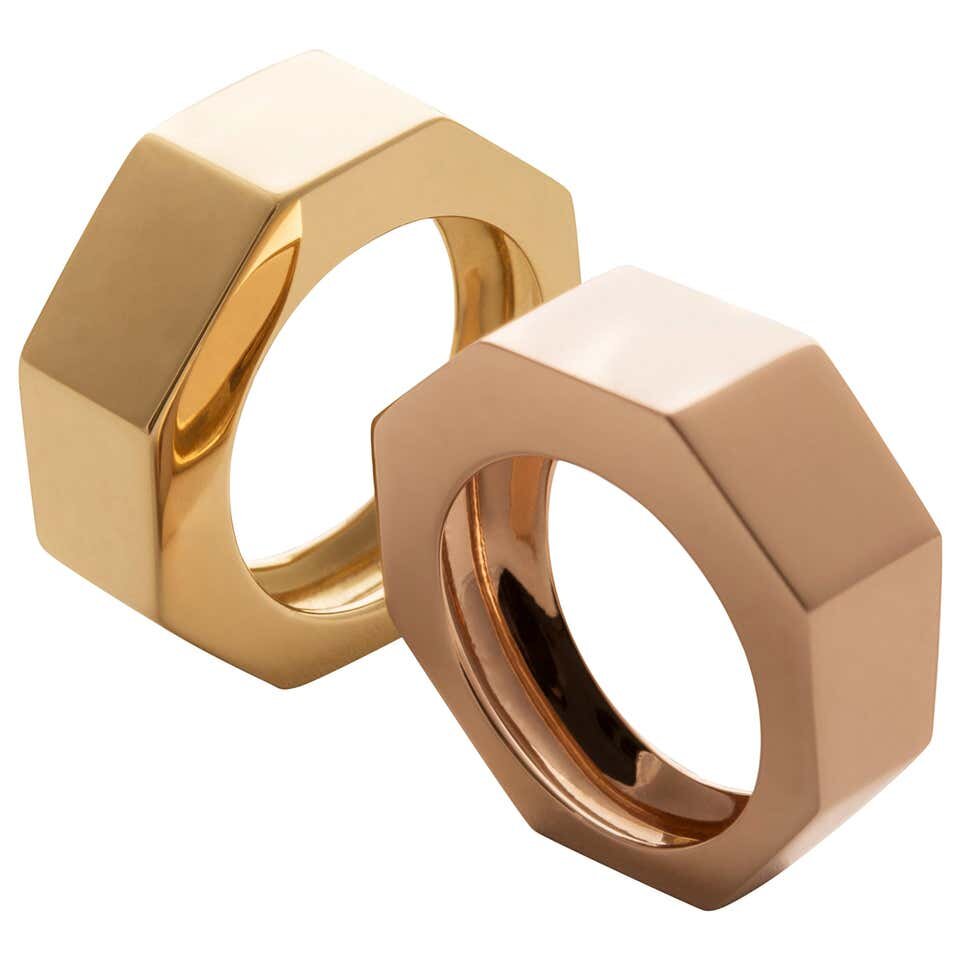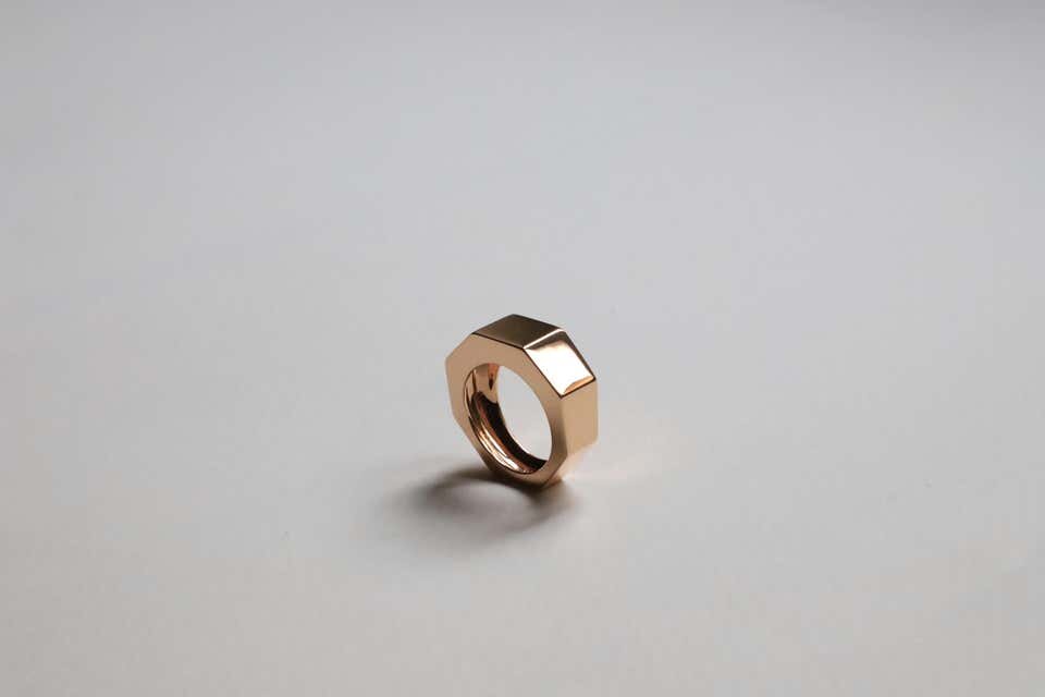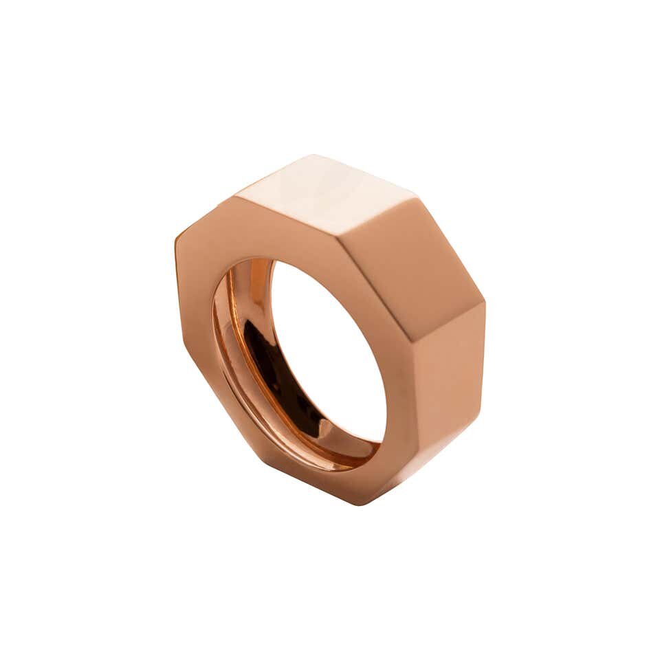From Rossella Ugolini's Castelli collection. The Italian historical and cultural tradition has inspired the idea of portraying the solid architecture of Italian castles on the jewels. The Castel del Monte ring faithfully recalls the octagonal shape of the Castle plan, a perfect geometric shape featuring a clear and distinct symbolism. Extreme value is given by the process of manufacturing, carried out entirely by hand, without any use of three-dimensional modeling technologies! From Rossella's eyes, witnesses of such an architectural beauty, up to the hands...tools of artistic creation.