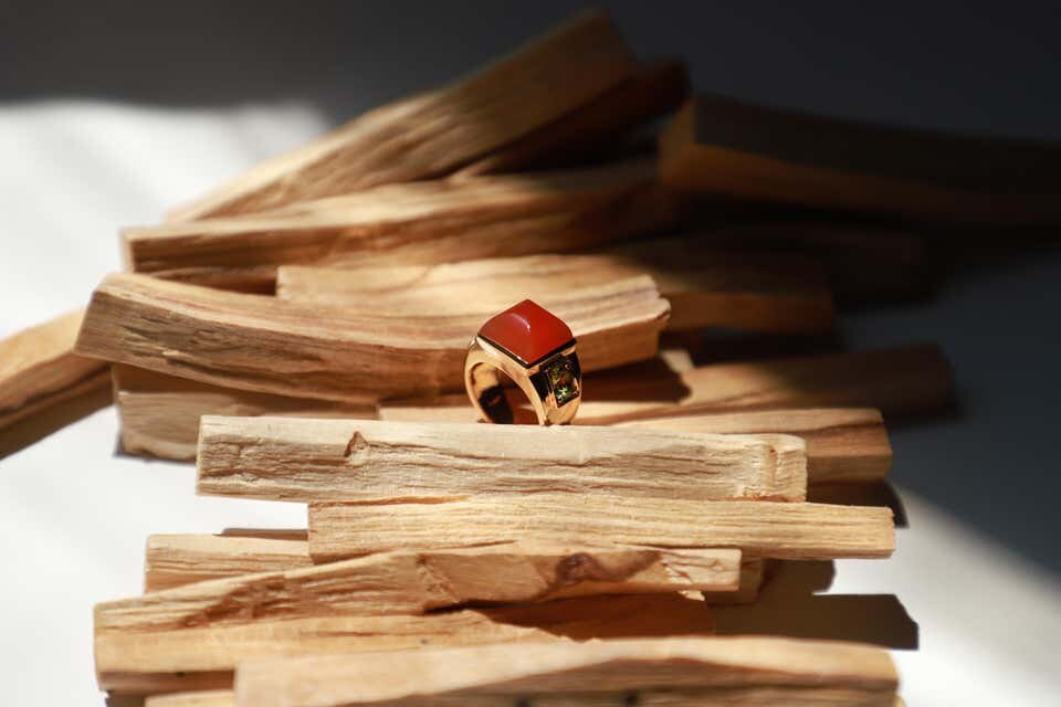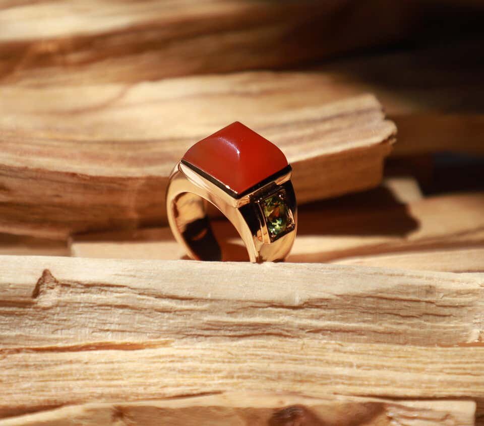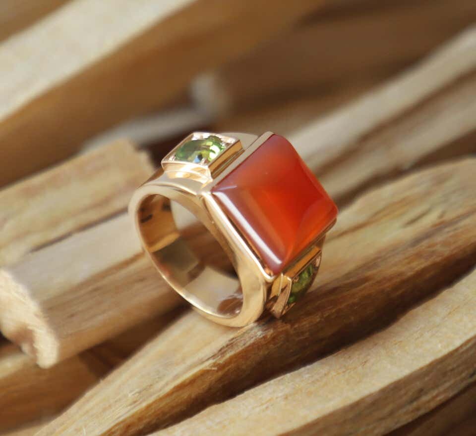 From Rossella Ugolini's Castelli collection. The Italian historical and cultural tradition has inspired the idea of portraying the solid architecture of Italian castles on the jewels. This ring takes inspiration from the architecture of the Barletta Castle in Barletta, Italy. It is handcrafted in 18k yellow gold and embellished with peridot and carnelian. The carnelian is an amazing stone with multiple spiritual benefits: it improves your mood, infusing vitality, optimism and cheerfulness and cancelling negative feelings. Peridot could ease your fatigue with a sense of regeneration and harmony. It also increases joy and slowly opens the heart chakra.