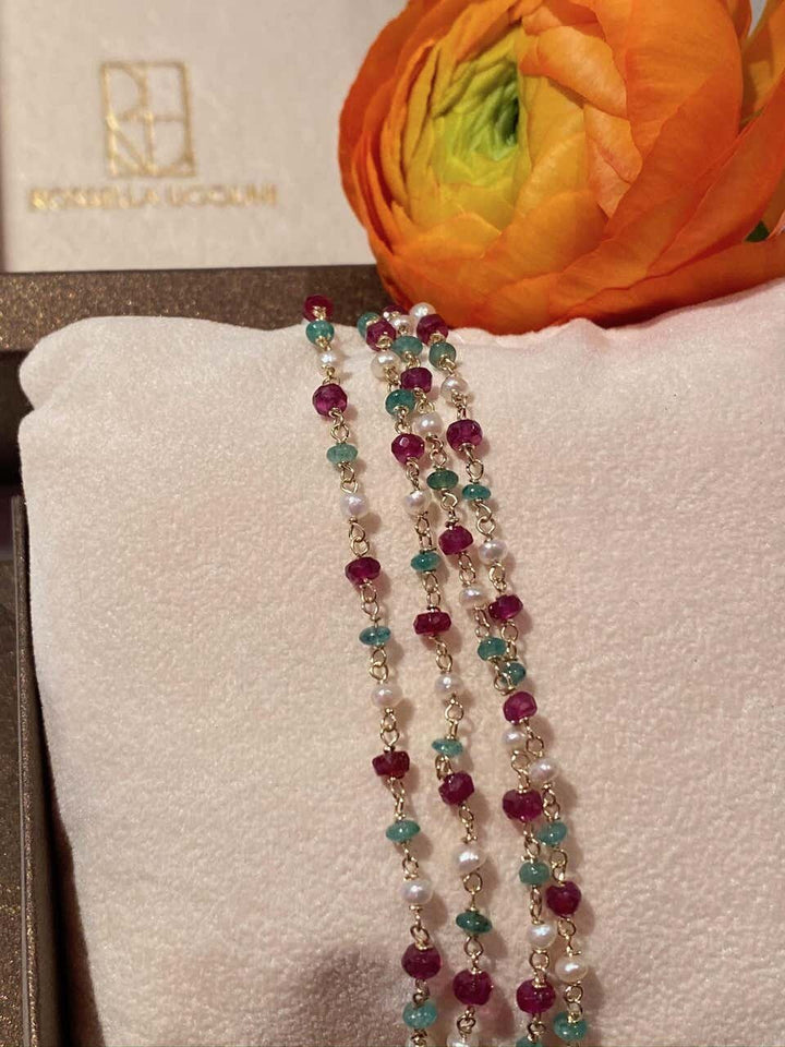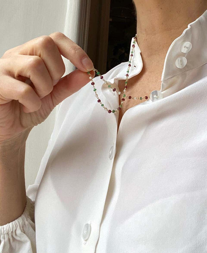 Here there is an amazing 18k yellow gold necklace adorned with 3 ct deep green emerald, red garnets and fresh water pearls. Every 3 beads there's a chain. The secret of this beautiful necklace lies in the handmade process that enriches it, every chain is linked one by one in an artisanal way. Emerald brings loyalty, enhances unconditional love and unity and promotes friendship. Garnet revitalizes, purifies, and balances energy, bringing serenity or passion as appropriate. Pearls are believed to offer protection, as well as attract good luck and wealth.