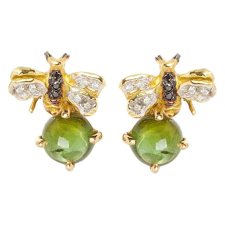 18k yellow gold with 0.10 ct white diamonds, 0.06 ct black diamonds and 3.2 ct green tourmalines.Dimensions: 15 mm height, 13 mm width, 5 mm depth.