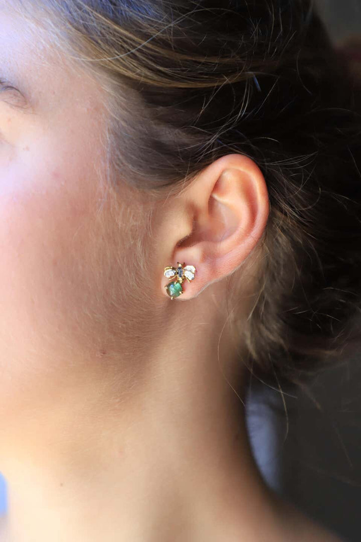 The bee is a creature that has always inspired Rossella from different points of view: from her ability to actively participate in a community, hard-working nature, essential for the correct development of the ecosystem, and last but not least, her ability to create geometric structures of millimeter precision and make them functional and fascinating. From the collection “Istinti', here is one of Rossella's creations to support this precious animal: 18k yellow gold earrings with white and black diamonds and deep green tourmaline stones. A versatile jewel, suitable from everyday life to the most important of occasions.
