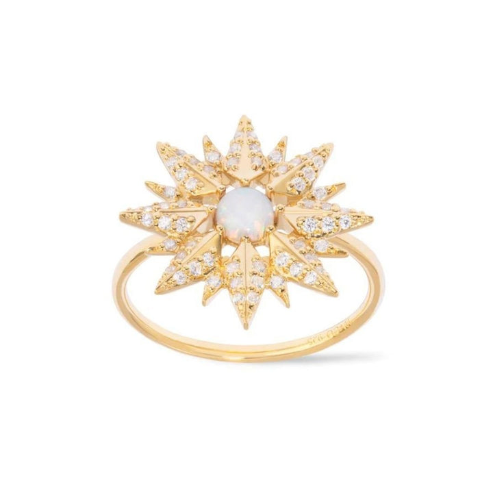 Malaysian entrepreneur Jenn Low founded Wanderlust + Co in 2009 with a vision of providing joyful, quality designs and luxe experiences at affordable prices. From these humble beginnings, Jenn grew Wanderlust + Co from strength to strength into a global fashion jewelry brand. Wanderlust + Co creates meaningful jewelry that is kind to your skin and our planet. Inspired by energy and intuition, every piece is designed by women, for women.Style notes: Handcrafted to last in our signature 925 sterling silver and 14K gold vermeil, channel your inner sun goddess with our Sunseeker Horizon demi-fine ring - the perfect statement piece to catch light at every angle. Price: Please note price may vary due to exchange rate differences or shipping, duties and taxes. Price may also vary with materials choice. Final price is calculated at checkout at the designer's website. Materials: 14k gold vermeil with white topaz and white opal. Dimensions: Charm: 1.8cm diameter.