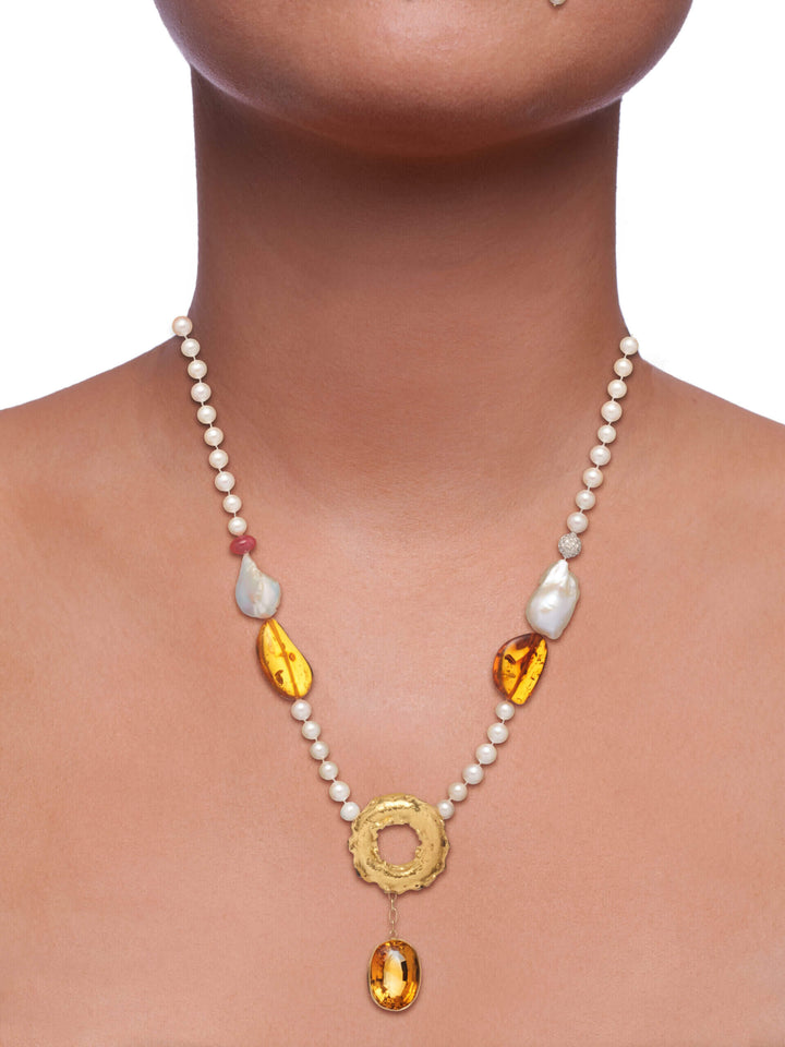19.25k yellow gold with 31.7 ct topaz, 0.23 ct ruby, 0.40 ct diamond, 0.24 ct amber, baroque pearls and Akoya pearls.Dimensions: 7cm length, 3cm width.
