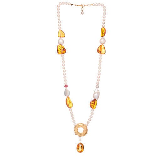 The inspiration for this necklace started from amber. Amber is a fossil resin widely used in jewellery and is often considered a precious stone. It is a fascinating and very mysterious stone due to its composition, originality, shape, colour, size and a multitude of characteristics. In the center we have an open circle, a volcano crater in 19.25ct yellow gold, surrounded by pearls and amber. The coral and the ball with diamonds represent the irreverence of the human being. This jewellery belongs to the “Terras do Além' collection.