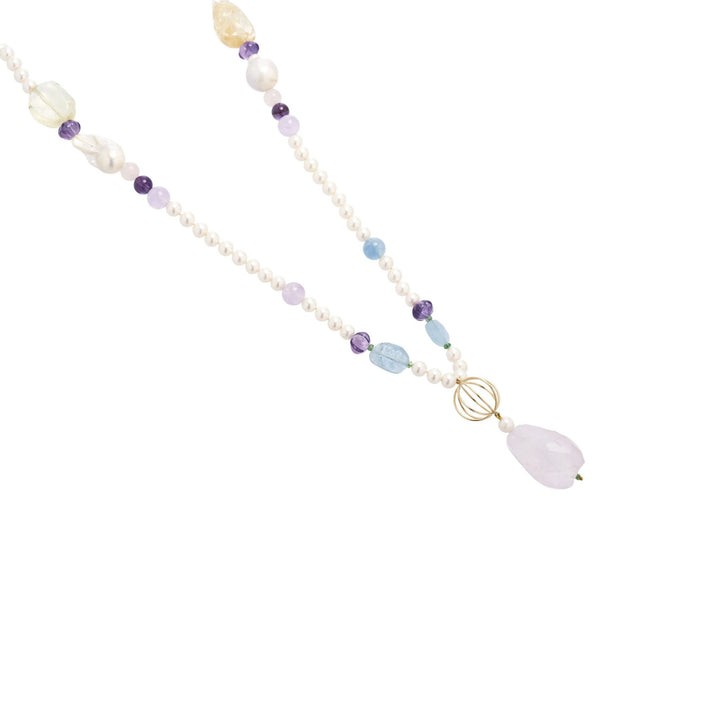19.25k yellow gold with 1.4 ct quartz, 2 ct topaz, 2 ct amethyst, 15 ct aquamarine, 4 ct aquamarine and pearls.