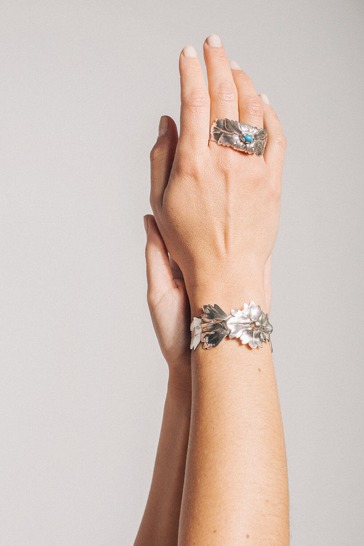 Tender and teeming with floral, organic lines, Joana Mota Capitão's LUZ collection shows us the romantic character of a love story. This story is just like every other story, surely, but still unique and a candid exception for the rest of the world. LUZ is made of stories and memories, mental keepsakes forever in a drawer that were left until the right moment to recapture them came. It's the odd-shaped iron hardware that grace LUZ and that turn into the ultimate inspiration for strong yet plain pieces, heavy on feelings, and lusty silhouettes.