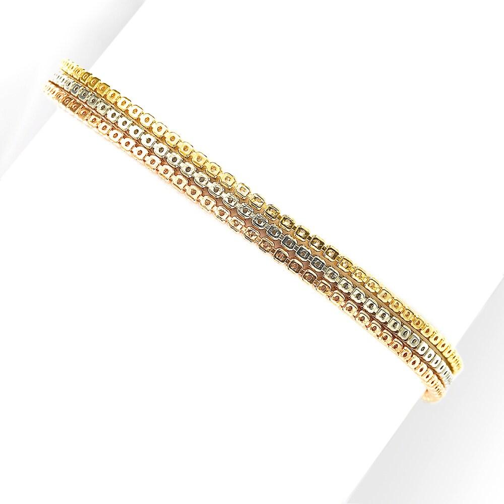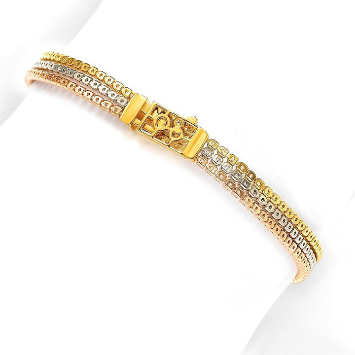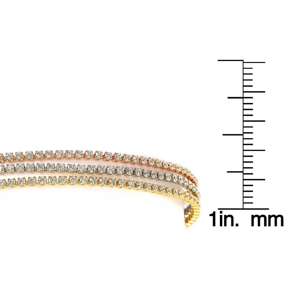 This Suzy Levian Tri-Tone Sterling Silver Cubic Zirconia Bracelet is a stunning fusion of color and brilliance. Featuring three interconnected rows of pave-set white cubic zirconia, this bracelet creates the illusion of three separate bracelets without the hassle of tangling. Designed in rose, gold, and white sterling silver, this tri-tone masterpiece adds a unique and sophisticated touch to any jewelry collection. A hidden lock ensures a secure and stylish fit.