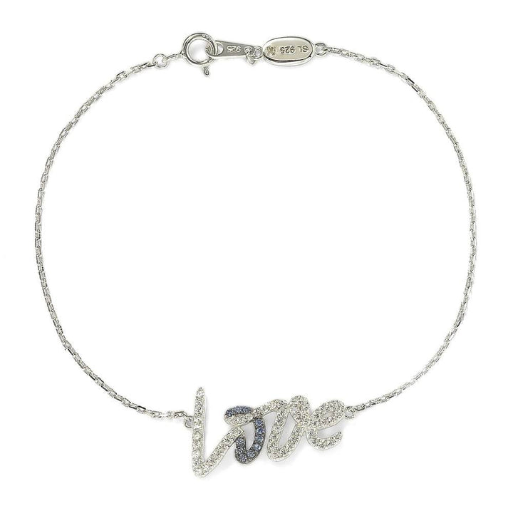 Handcrafted in sterling silver with a high-polish finish. Features micro-pave-set round-cut blue sapphires and created white sapphires forming the word 'Love.' Includes Suzy Levian’s yellow-plated SL logo plaque with a hidden brown diamond. Secured with a spring ring closure.