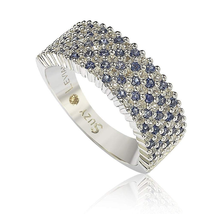 Handcrafted in sterling silver with a high-polish finish. Features a crisscross pattern of natural blue sapphires and created white sapphires in a half-band design. Includes a hidden brown diamond in the shank and a yellow-plated designer gallery with Suzy Levian’s SL logo.