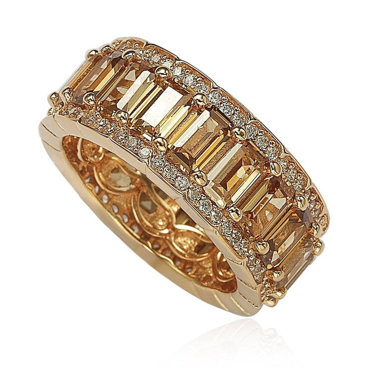 Handcrafted in rose gold-plated sterling silver. Features emerald-cut brown cubic zirconia stones with a pave-set white cubic zirconia border in a full eternity setting. Includes a hidden stone inside the band.