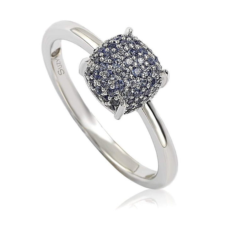 Handcrafted in sterling silver with a high-polish finish. Features pave-set natural blue sapphires and created white sapphires. Includes a hidden 0.02 ct diamond in the shank and a golden SL logo in the under-gallery.