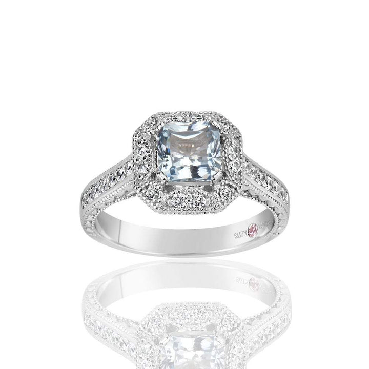 Handcrafted in sterling silver with a high-polish finish. Features an Asscher-cut light blue aquamarine cubic zirconia center stone, surrounded by a halo of white cubic zirconia. Includes a hidden stone in the shank, a closed under-gallery for comfort, and a golden SL logo.