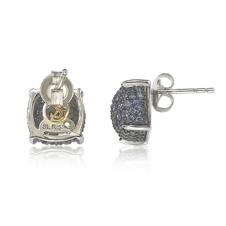 Handcrafted in sterling silver with a high-polish finish. Features natural round-cut blue sapphires in a pave setting. Includes a hidden brown diamond (.02ct) in the back, a closed back-gallery, and a golden SL logo. Secures with a post and butterfly closure.