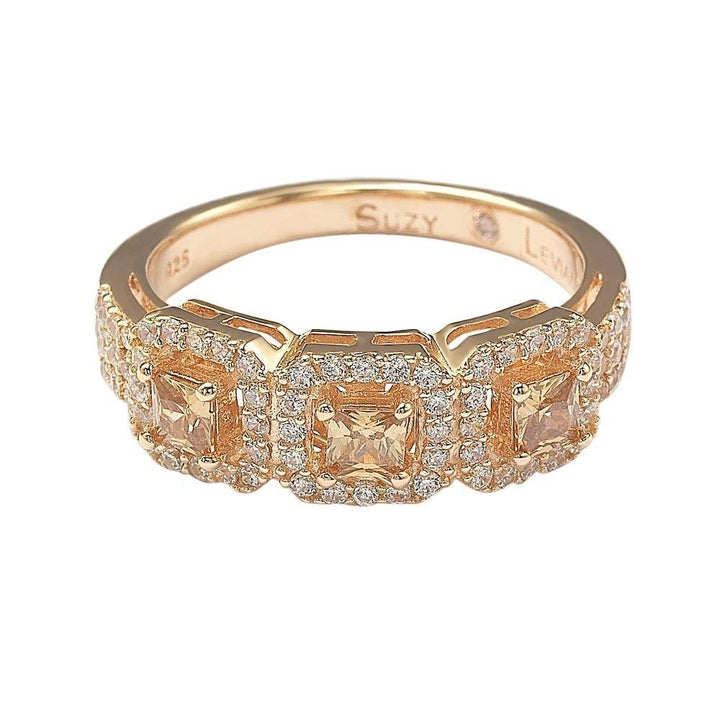 This Suzy Levian Rose Sterling Silver Brown Cubic Zirconia 3-Stone Asscher-Cut Band is a bold and luxurious statement. Three asscher-cut brown cubic zirconia stones are prong-set in a pave white cubic zirconia halo, creating an exquisite contrast of color and brilliance. Designed for both elegance and glamour, this ring makes a perfect anniversary or celebration piece. A hidden gemstone in the shank represents Suzy Levian’s signature message of empowerment.