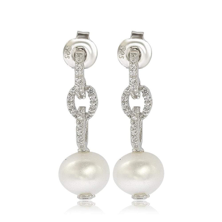 Handcrafted in sterling silver with a high-polish finish. Features created white sapphires set in interlocking circles, leading to 8mm white freshwater cultured pearls. Secures with a post and butterfly closure. Includes the Suzy Levian SL logo for an elegant finishing touch.