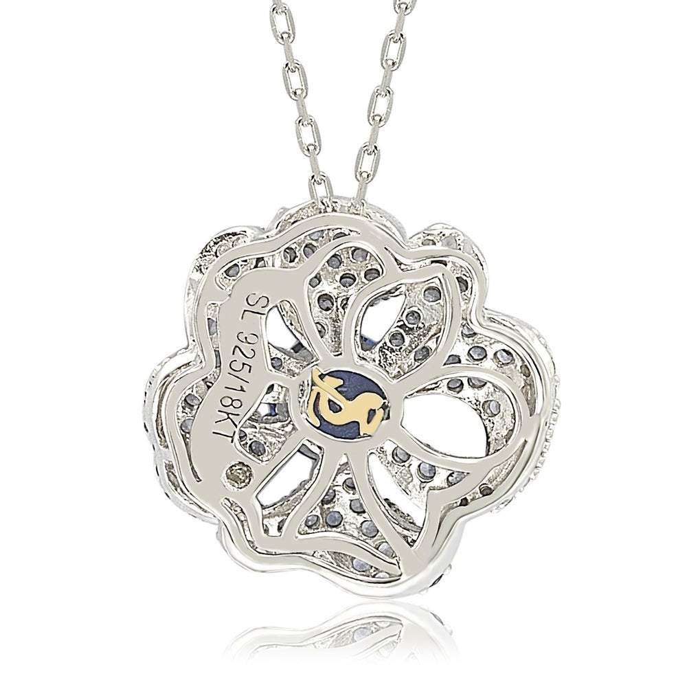 This Sterling Silver Sapphire and Diamond Accent Whimsical Flower Pendant Necklace by Suzy Levian is a captivating floral-inspired piece that radiates elegance. A large 1.05ct blue sapphire sits at the heart of this stunning pendant, surrounded by shimmering pave-set blue sapphires and created white sapphires. The intricate sterling silver setting, finished with a high polish, enhances the brilliance of each stone. Designed to celebrate beauty inside and out, this pendant features Suzy Levian’s hidden signature brown diamond (0.02ct) in the back, symbolizing empowerment and inner strength. The closed back-gallery and 18K yellow gold SL logo complete this timeless piece, making it an unforgettable gift for any occasion.