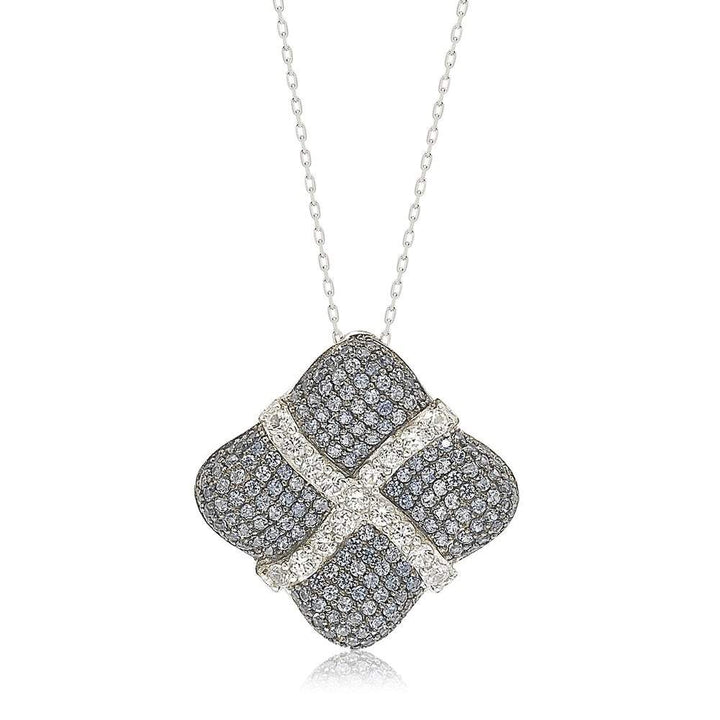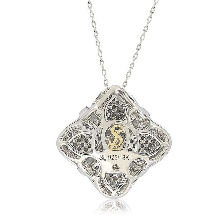 This Sterling Silver Sapphire & Diamond Wrapped Cushion Pendant by Suzy Levian is a celebration of elegance and craftsmanship. Designed to resemble a beautifully wrapped gift, this pendant showcases hand-set natural blue sapphires forming a striking cushion base. A crisscross pattern of created white sapphires wraps around the pendant, adding depth and dimension. The high-polish sterling silver finish enhances the vibrancy of the gemstones. As a signature touch, a hidden brown diamond (0.02ct) is set in the back, symbolizing inner beauty and confidence. A closed back-gallery and two-tone setting highlight Suzy Levian’s golden SL logo, making this pendant a meaningful and sophisticated choice for any jewelry lover.