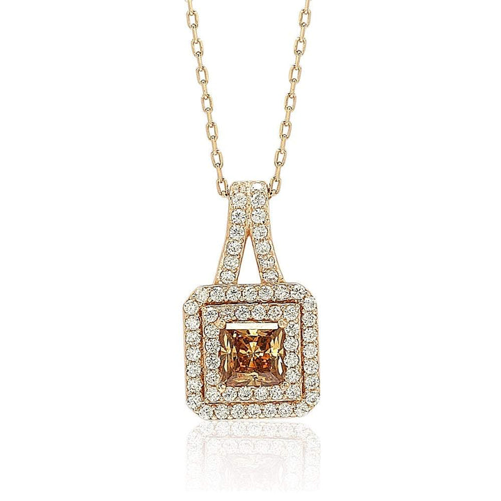 Handcrafted in rose-plated sterling silver with a brown Asscher-cut cubic zirconia center stone, framed by pave-set white cubic zirconia. Includes a hidden pink cubic zirconia in the back. Suspended from an 18-inch sterling silver cable chain with a spring ring clasp. Finished with a two-tone back gallery featuring the SL logo.