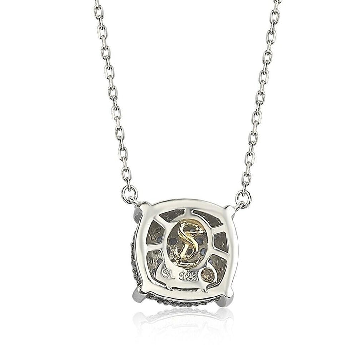 Handcrafted in 925 sterling silver with pave-set natural blue sapphires. Features a hidden brown diamond in the back gallery. Suspended on an 18-inch sterling silver chain, attached on both sides for a seamless fit. Finished with a golden SL logo and a high-polish finish.