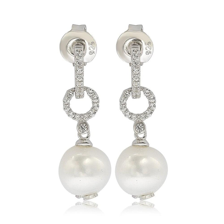 Handcrafted in 925 sterling silver with pave-set created white sapphires and 8mm white cultured freshwater pearls. Designed with delicate interlocking loops for fluid movement. Secured with butterfly backings for a comfortable fit. Includes the Suzy Levian logo at the base of each earring.