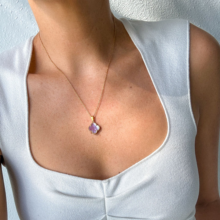 Handcrafted in 14K yellow gold vermeil. Features a quatrefoil-shaped pendant in pink. Designed for effortless layering.