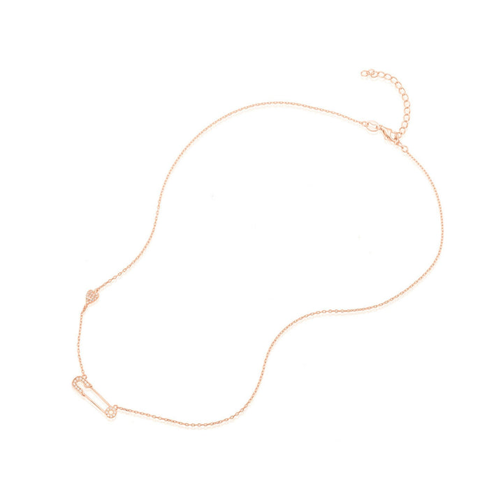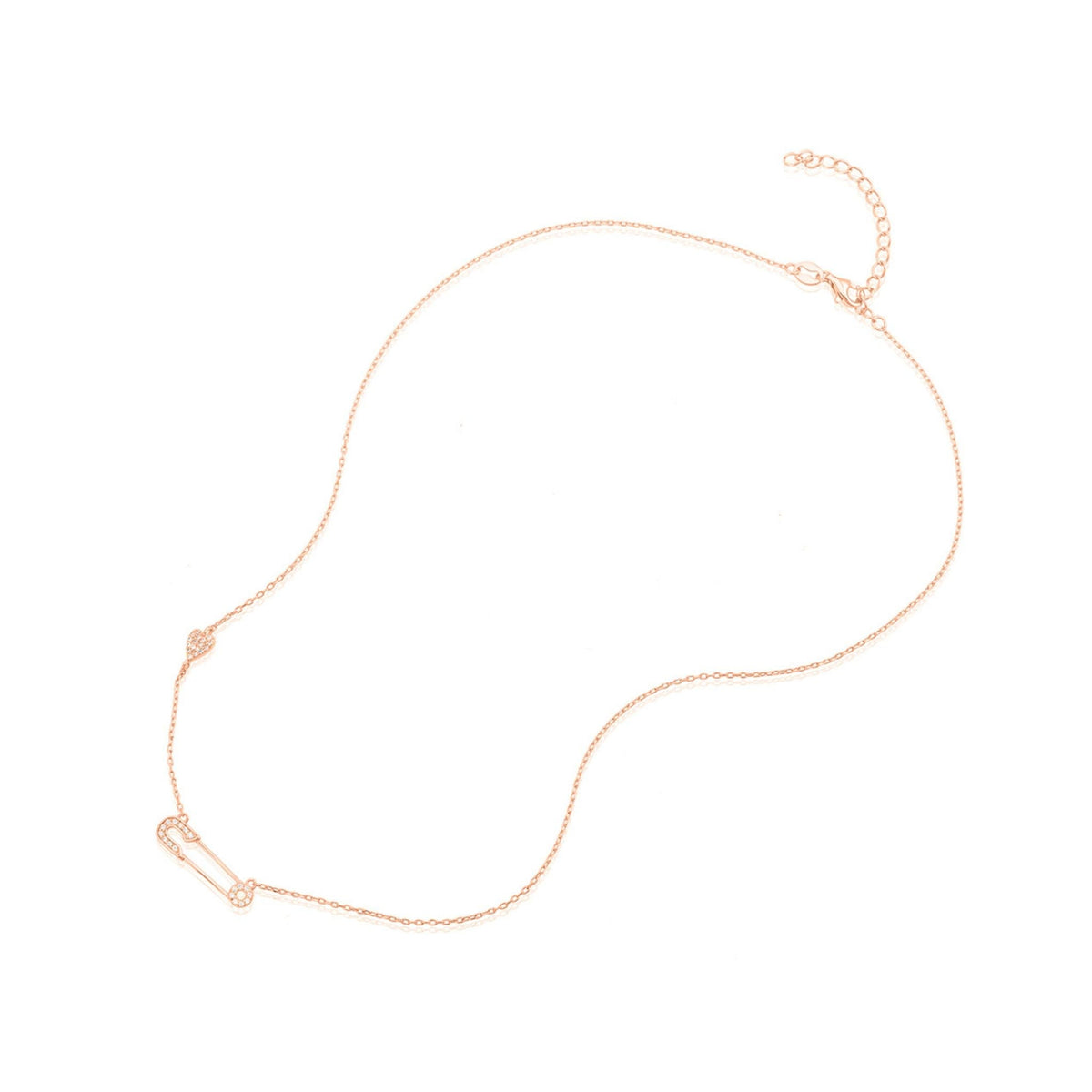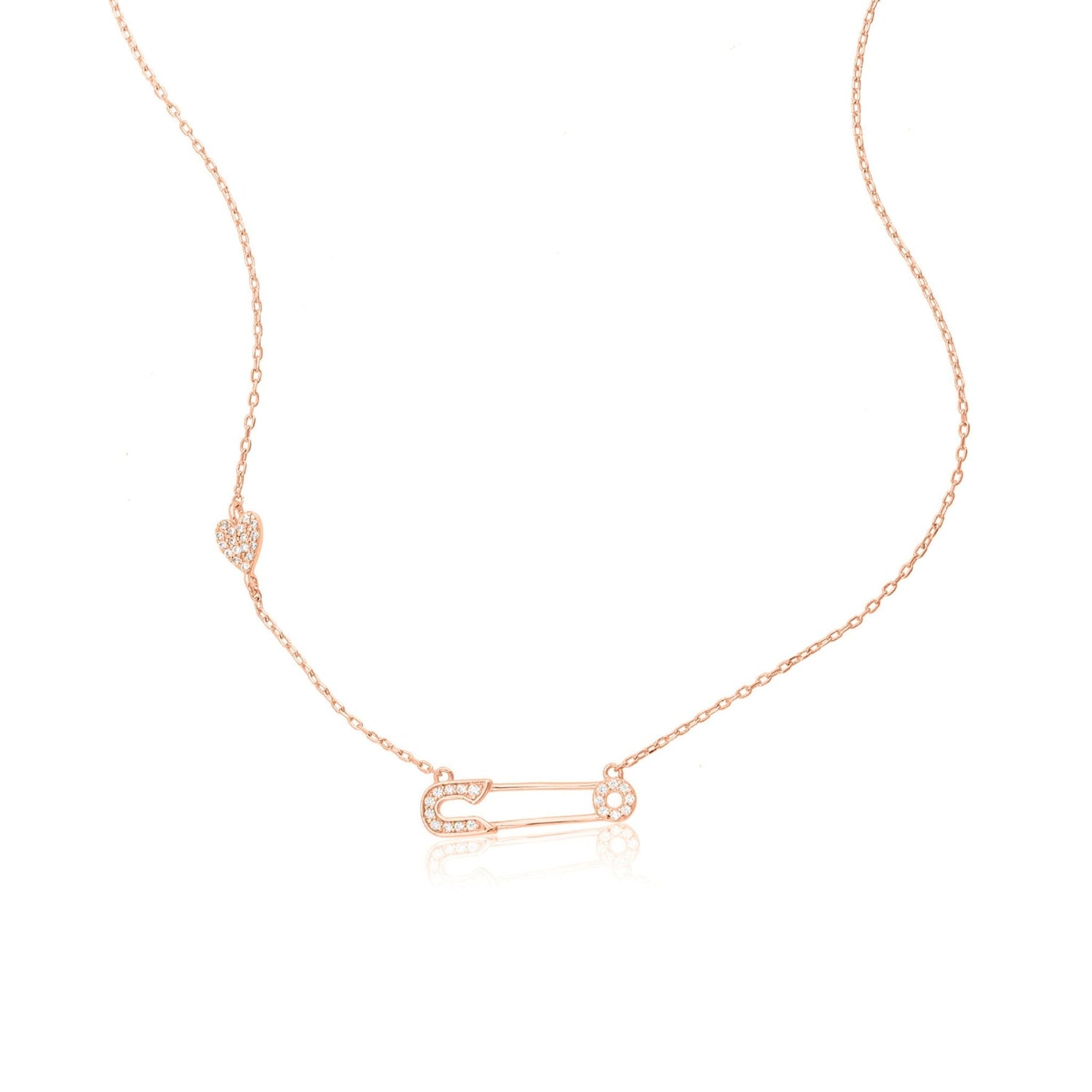 Crafted in rose gold-plated brass. Features a safety pin heart pendant. Designed for minimalist elegance.