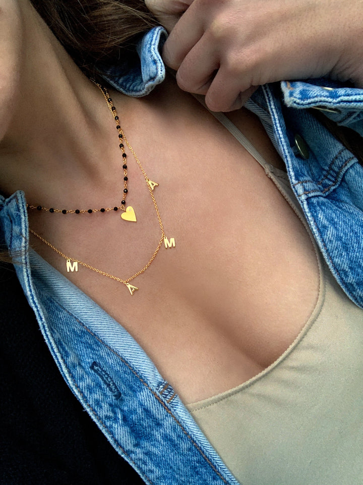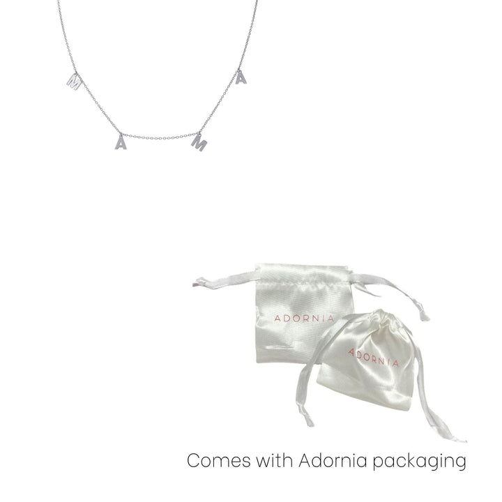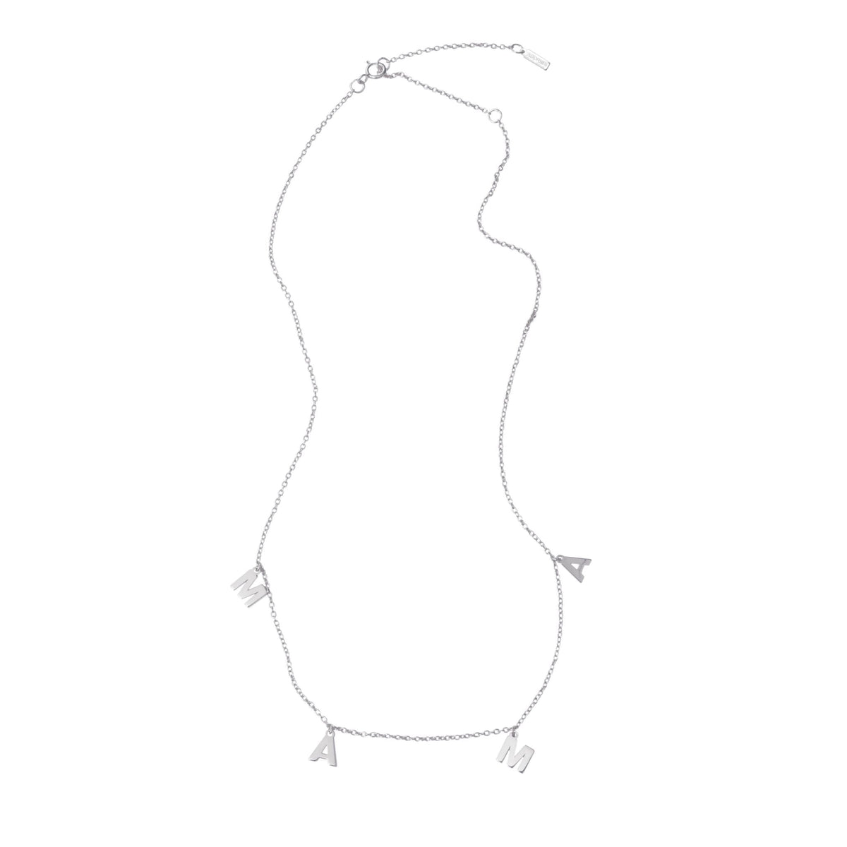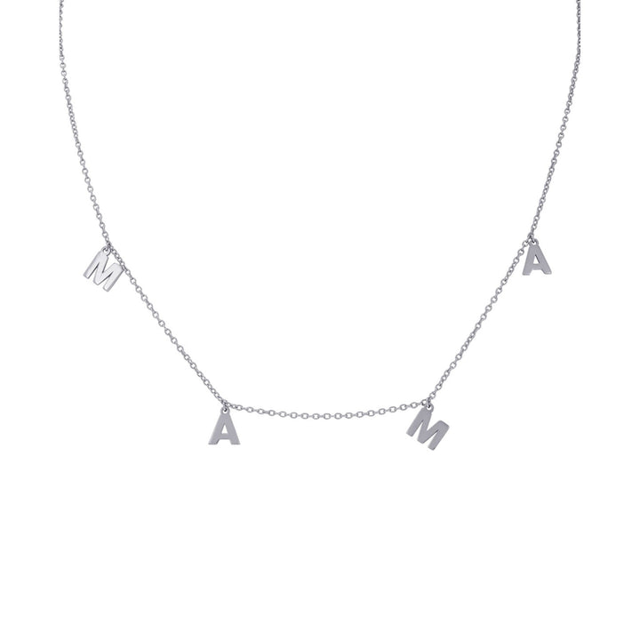 Crafted in white rhodium-plated brass. Features .25-inch spaced “MAMA” letter details. Adjustable 15-18 inch chain with a spring lock closure.