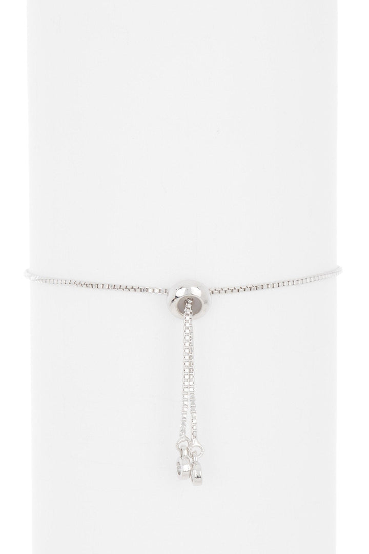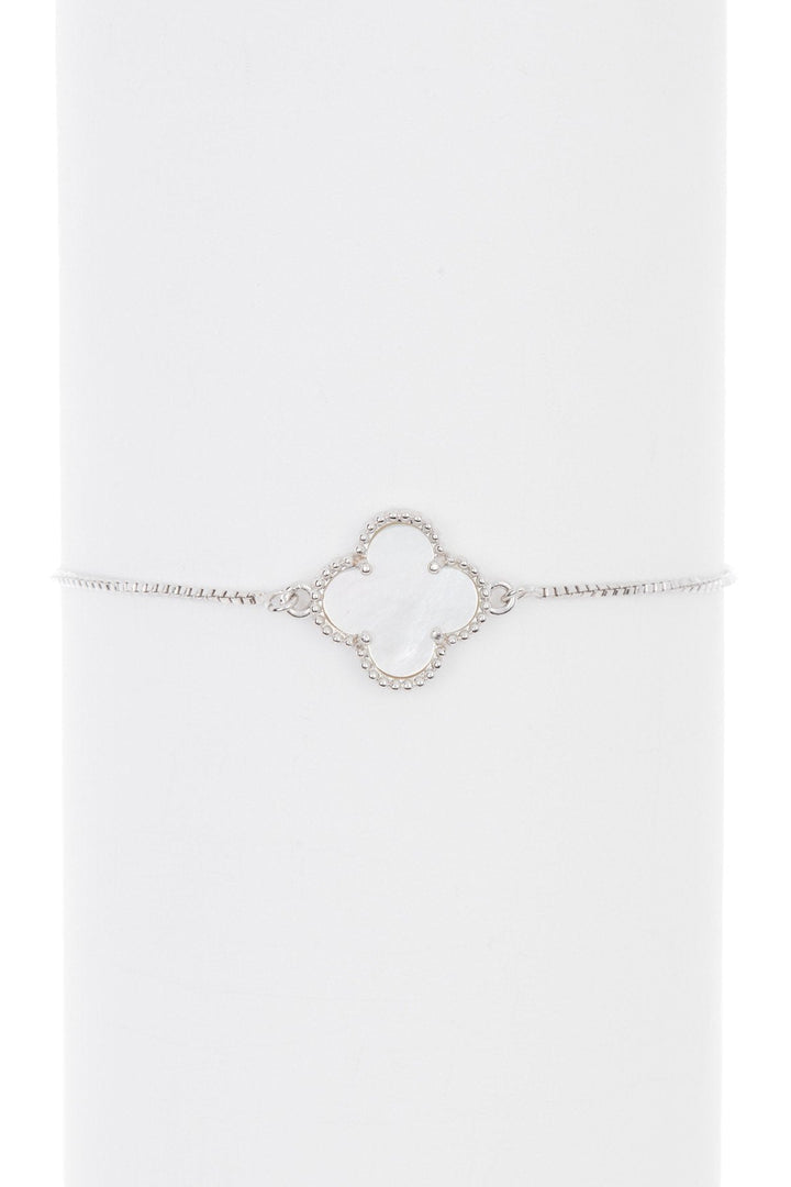 Crafted in white rhodium-plated brass with a mother-of-pearl flower charm (0.5' diameter). Adjustable bolo closure for a custom fit. Designed to fit standard wrist sizes.